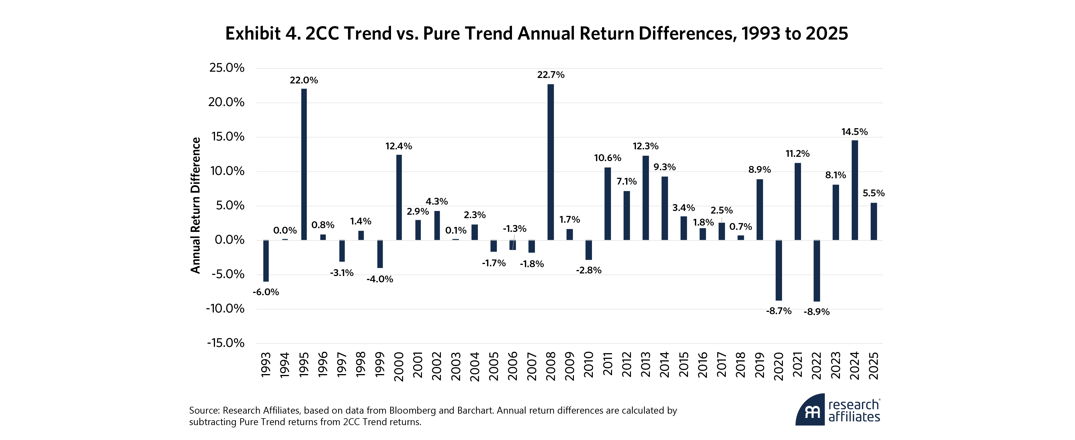 Of course, how these results manifest themselves in a portfolio context is the critical consideration. Our portfolios begin in January 1993, when at least five instruments are available in each asset class. The final trend strategies are equal risk averages of the MAC X1 to X6 portfolios targeting 10%–12% volatility. Exhibit 3 shows the cumulative returns for both Two-Sided CC (2CC Trend) and Pure Trend. Exhibit 4 compares their annual returns across all asset classes.