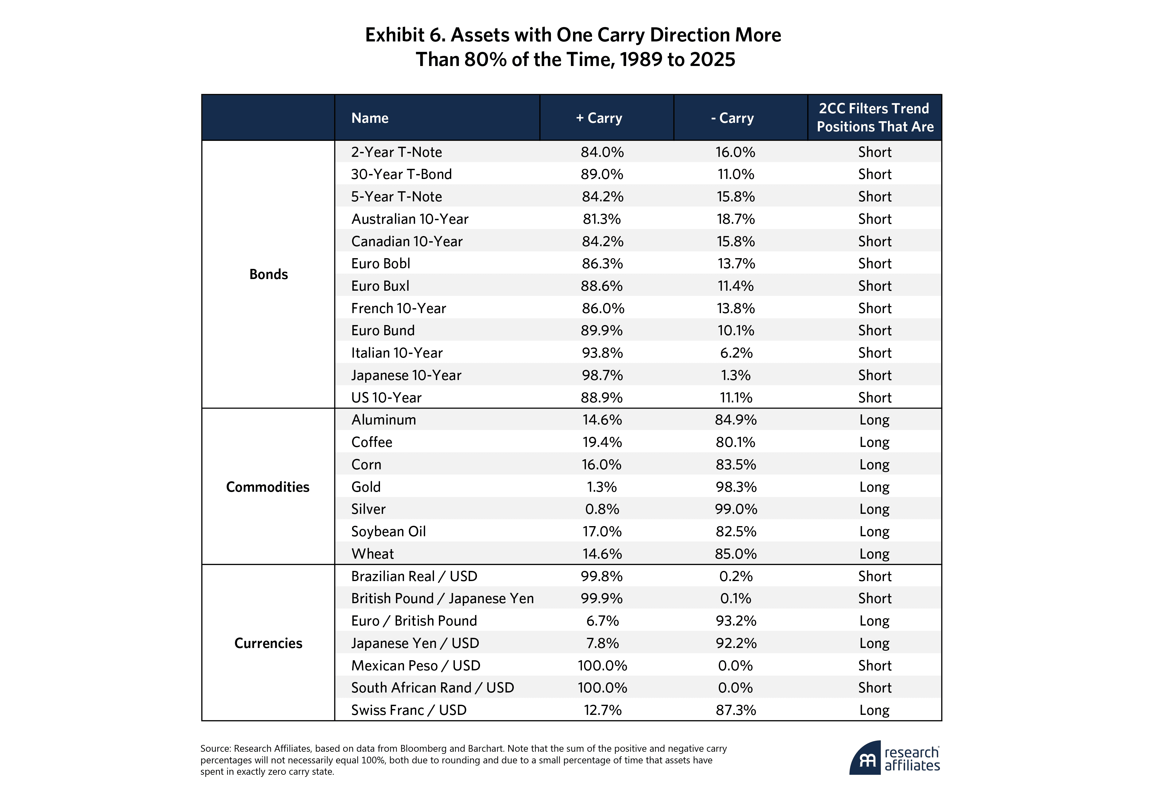 While 2CC Trend offers advantages over Pure Trend over time, the implications vary by asset class. As we noted, since precious metals mostly have negative carry, 2CC Trend cannot take long positions in those assets. Indeed, Exhibit 6 shows other similar assets, specifically 26, whose carry stances over the full sample have been concentrated at least 80% of the time in a single direction.