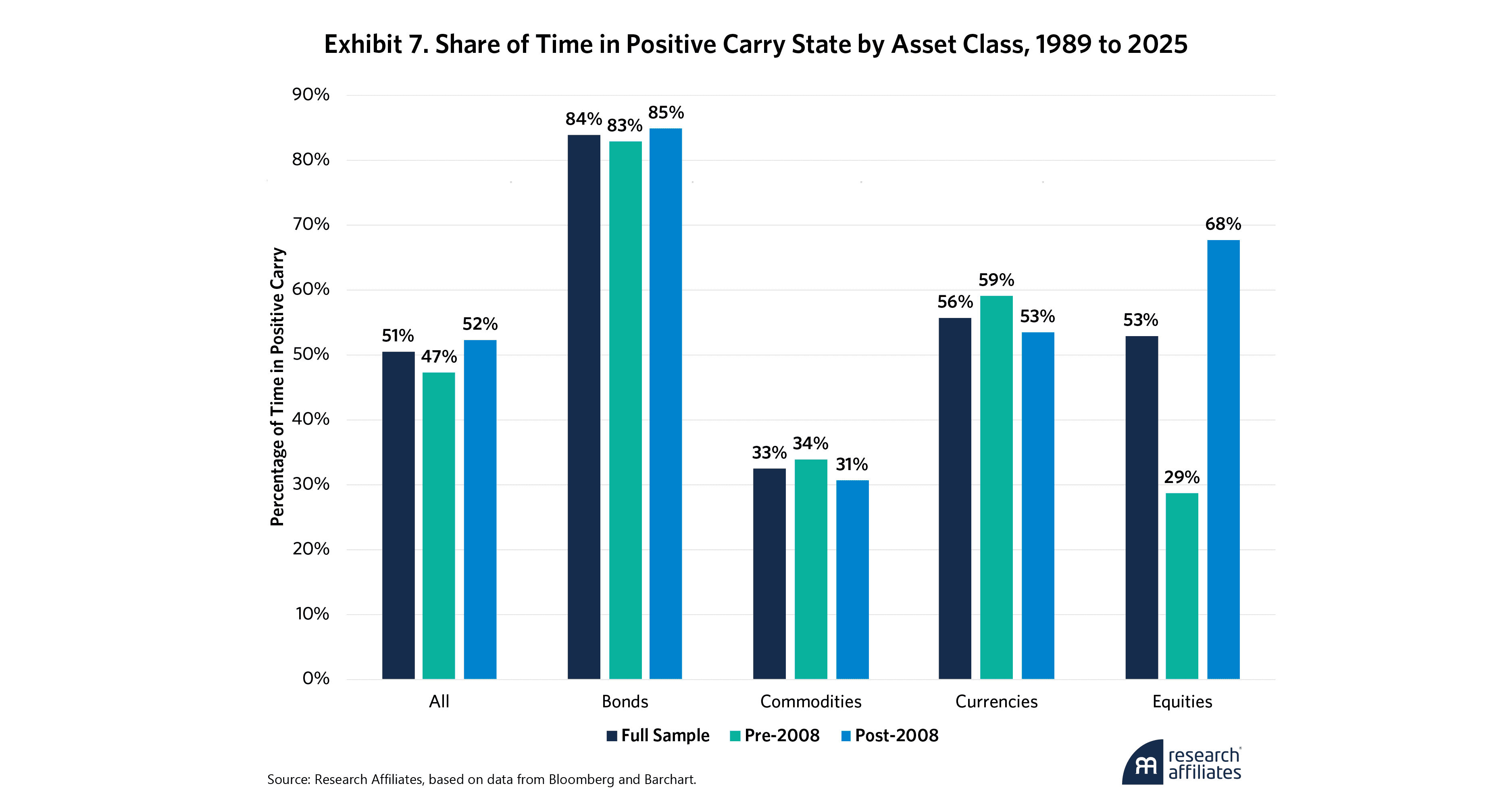 To better anticipate carry conditioning’s influence on Pure Trend, we examine carry’s evolution over time and across various assets. Exhibit 7 shows the average time asset classes spent in a positive carry state since 1989, as well as before and after the Global Financial Crisis (GFC).