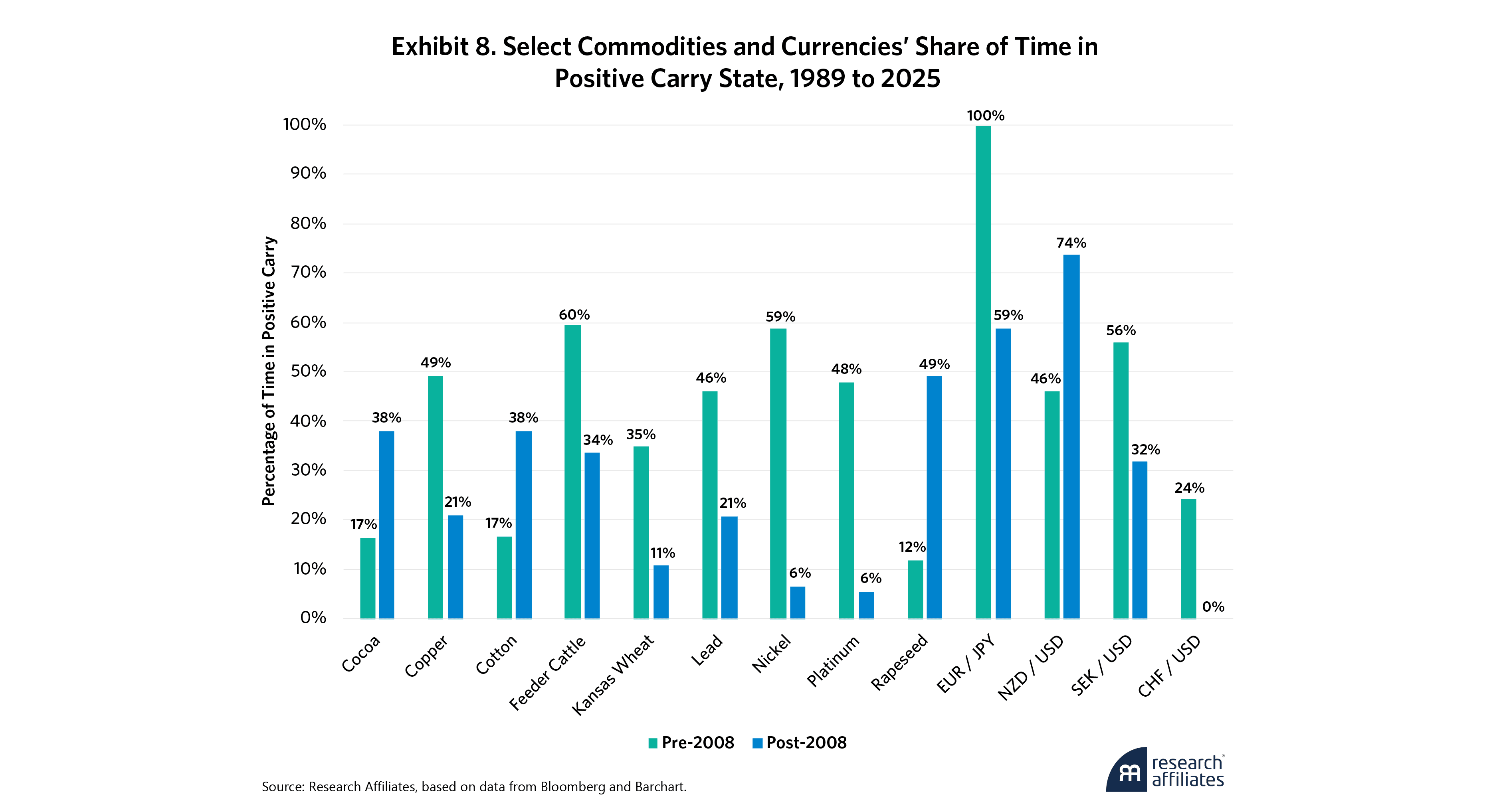 The commodities narrative is more idiosyncratic; consider the cases of copper, lead, and nickel. As Omura and West (2015) document, storage costs for these markets increased by 91% on average from 2003 to 2013 on the London Metals Exchange. This explains the decline in the percentage of time these assets have spent post-2008 in a positive carry state compared to the pre-2008 period; the increasing storage costs overwhelmed the declining interest rate backdrop.