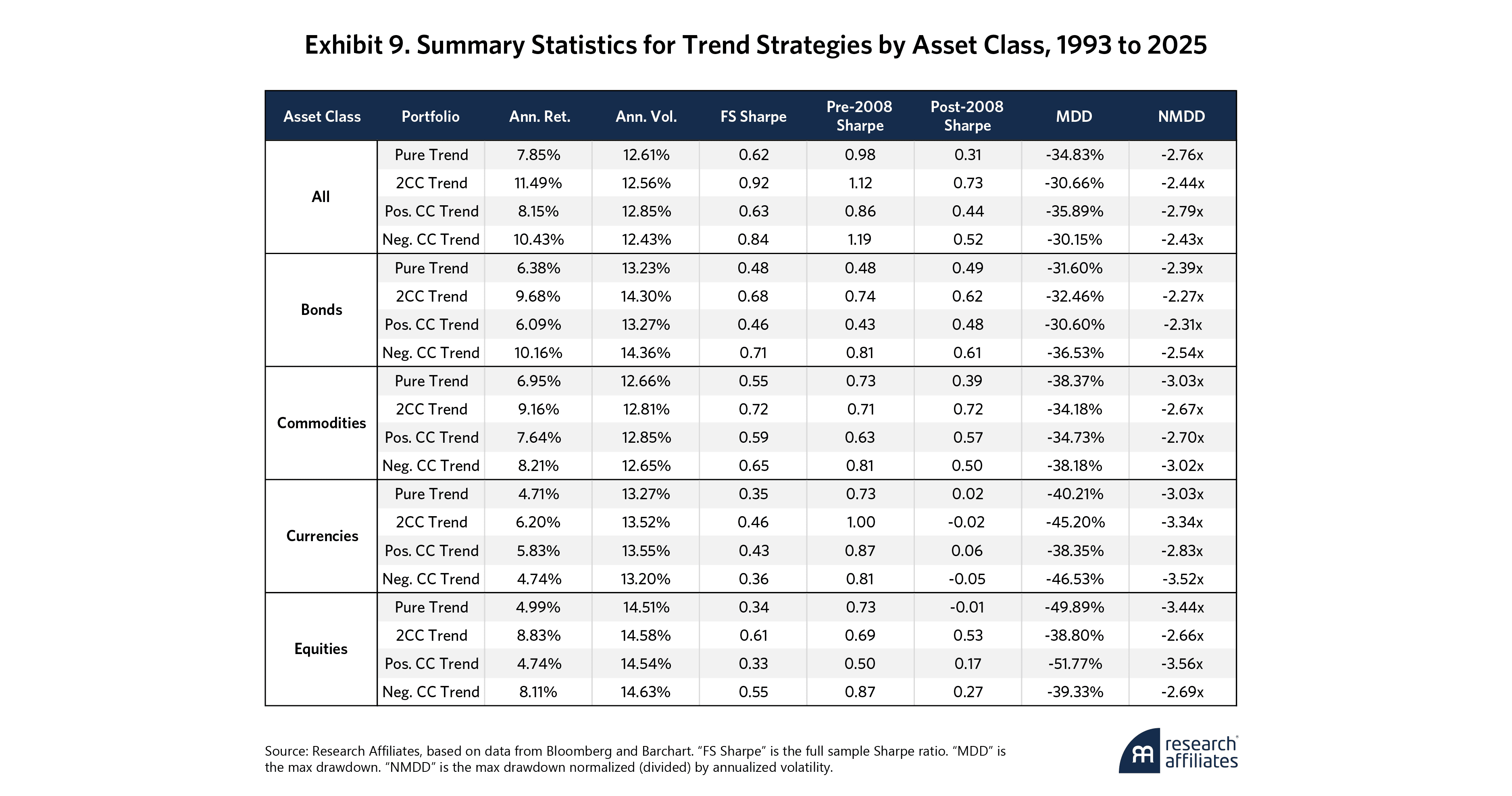 Whether these carry dynamics will continue in the future is an open question, but how these historical changes have affected trend strategies is an important consideration. Exhibit 9 shows summary statistics for trend following portfolios formed on each asset class, as well as with each type of carry-filtering system from Exhibit 1, and compares them with the Pure Trend approach.