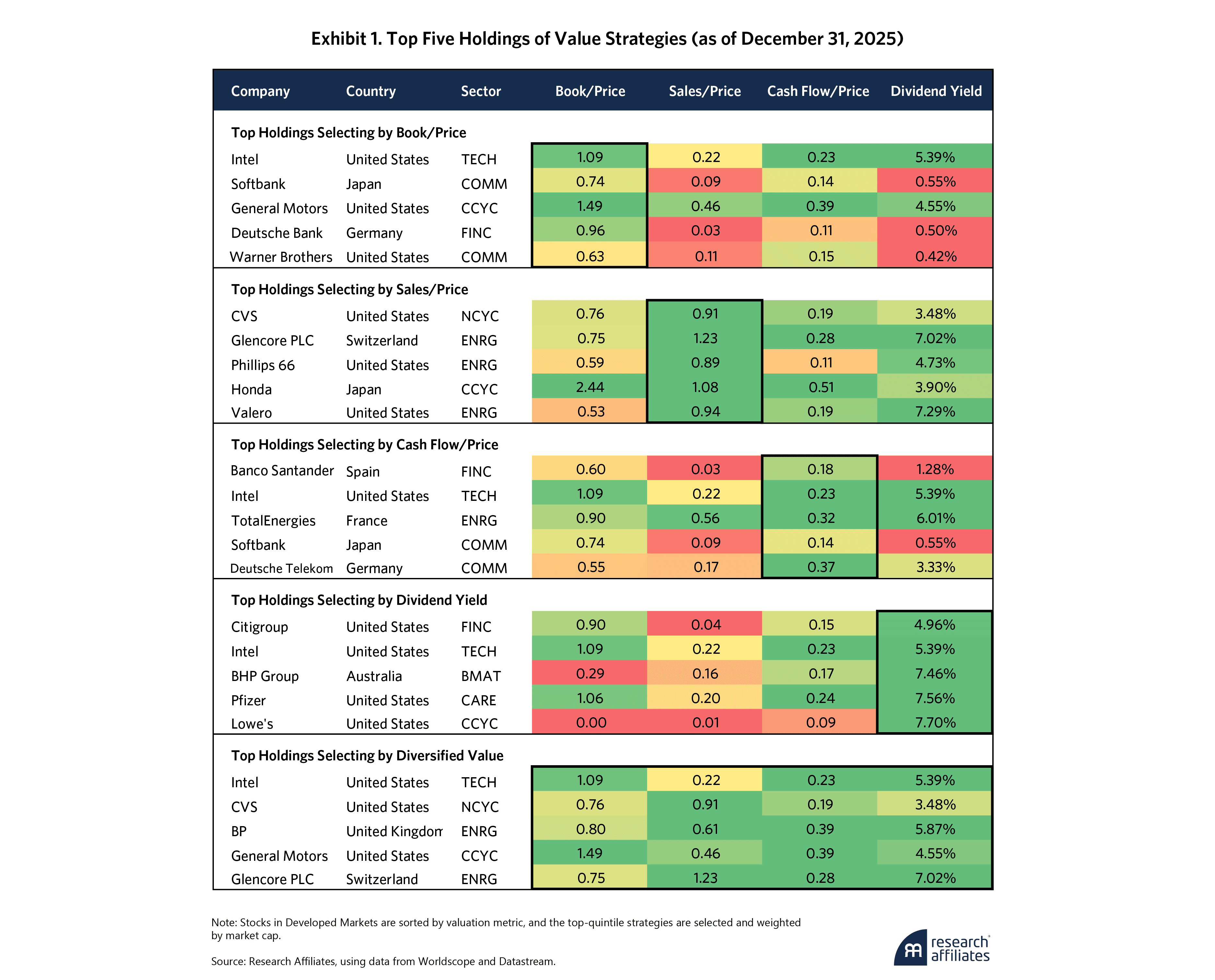 Consider a value investor who is only concerned with a single definition of value, such as the book-to-price or sales-to-price ratio. Such a one-dimensional philosophy would result in a portfolio that not only falls short on other dimensions of value but also lacks in diversification and performance. Exhibit 1 shows the resulting top five holdings of a set of single-metric value strategies that select stocks along a given dimension. The fifth strategy selects companies as determined by our Diversified Value signal, which combines all four metrics and incrementally refines for intangibles and buybacks.