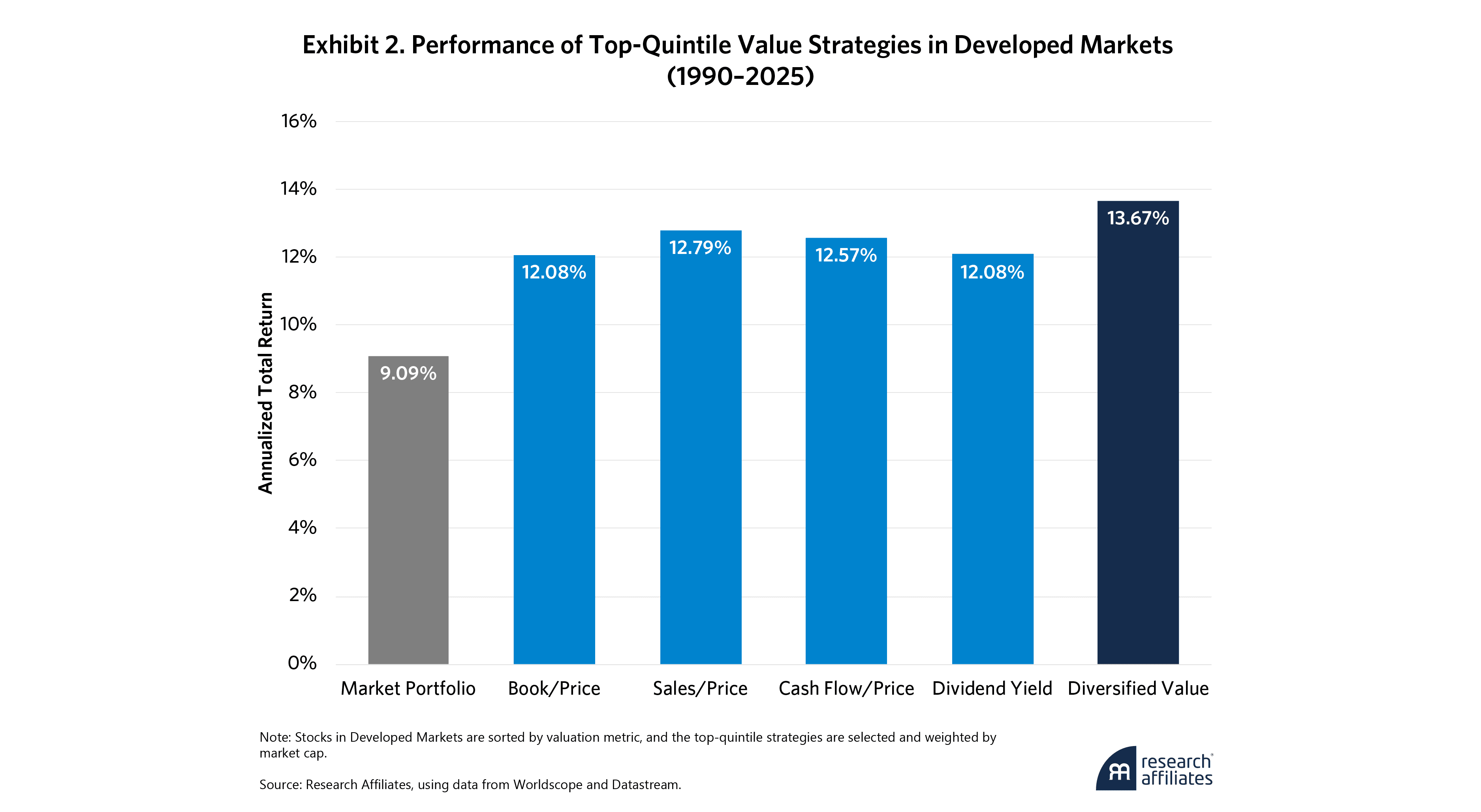 Value stocks selected according to their book-to-price ratio, for example, could look cheap on that basis alone but still could be unattractive along other dimensions, such as sales to price, cash flow to price, or dividend yield. Selecting stocks by Diversified Value ensures that a company’s attractive valuation is confirmed across multiple dimensions simultaneously. This more comprehensive value approach has an impact on performance as well. Exhibit 2 shows the simulated performance of the above five value strategies over the 1990–2025 period.
