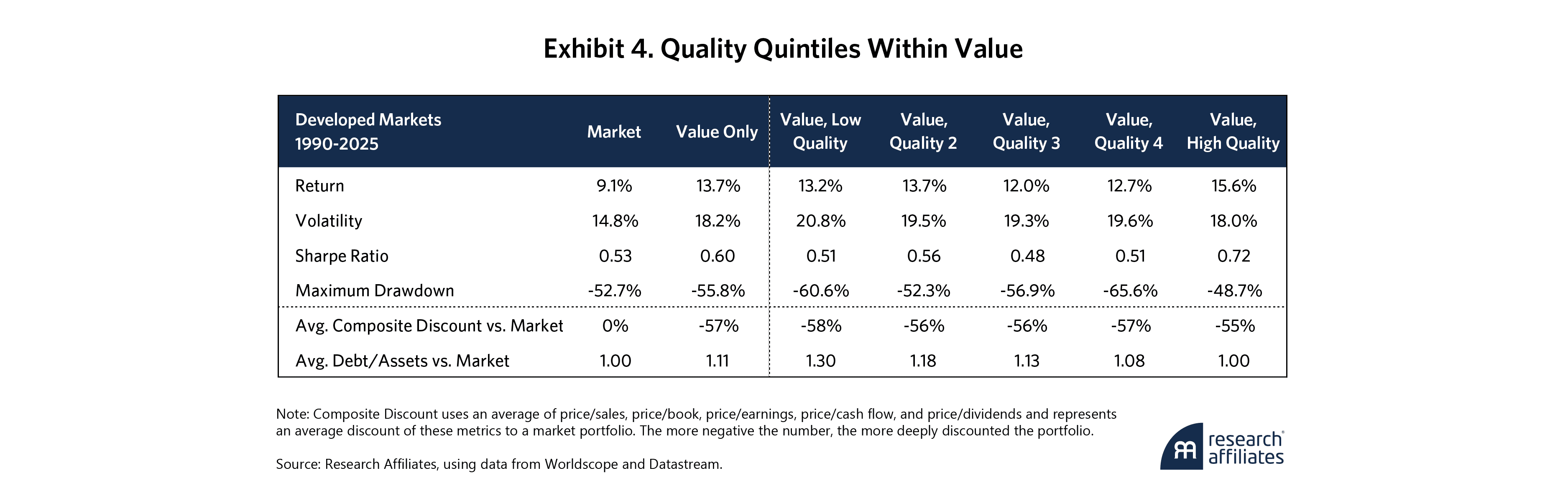 This tendency for quality to provide a smoother ride without sacrificing performance is a result of using a composite of quality signals that, in combination, are uncorrelated with value. Note the valuation and debt/assets statistics of the high-quality value portfolio compared with the lower-quality value portfolios. Even though the quality portfolio has lower financial leverage, it is priced at nearly the same discounted valuation as the lower-quality value portfolios. Avoiding the lower-quality, cheap-for-a-reason stocks is key to risk mitigation for any successful value manager.