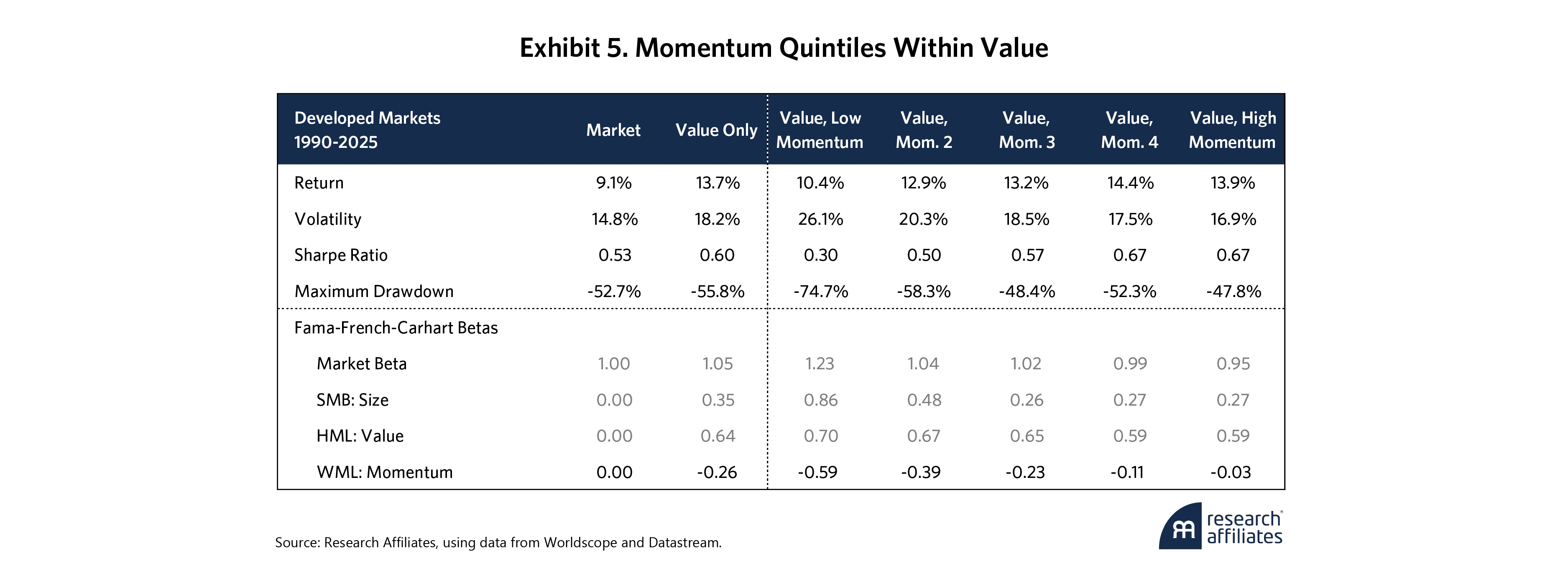 Exhibit 5 looks again at our same top value quintile from previous sections, this time dividing it into five quintiles by momentum.