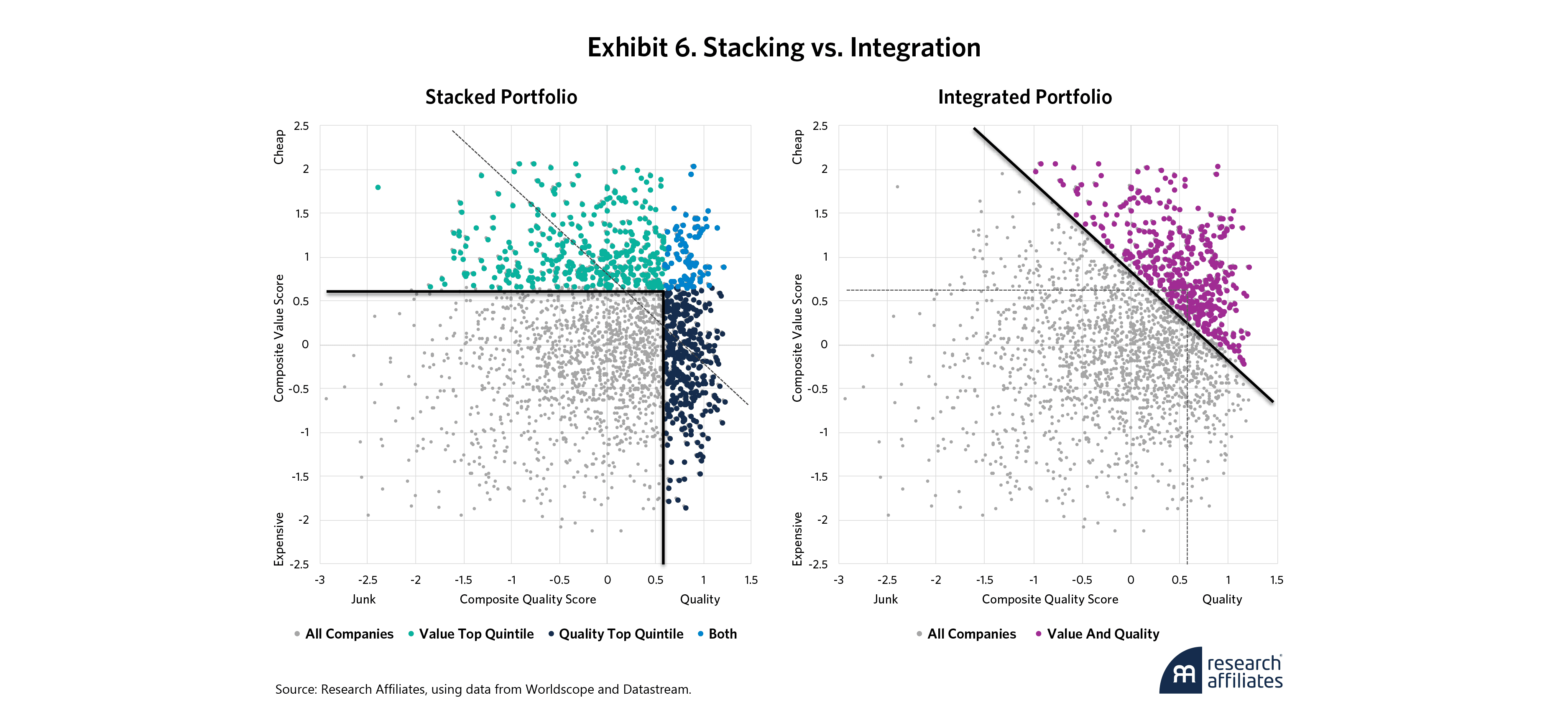 In this example, the stacked portfolios contain many stocks that are expensive or junk. The integrated approach on the right looks for companies that are varying degrees of value plus quality, capturing the additive effects of the signals. Integration ensures that capital is allocated to securities that are simultaneously attractive across multiple dimensions, rather than averaging across separate portfolios that may internally conflict.