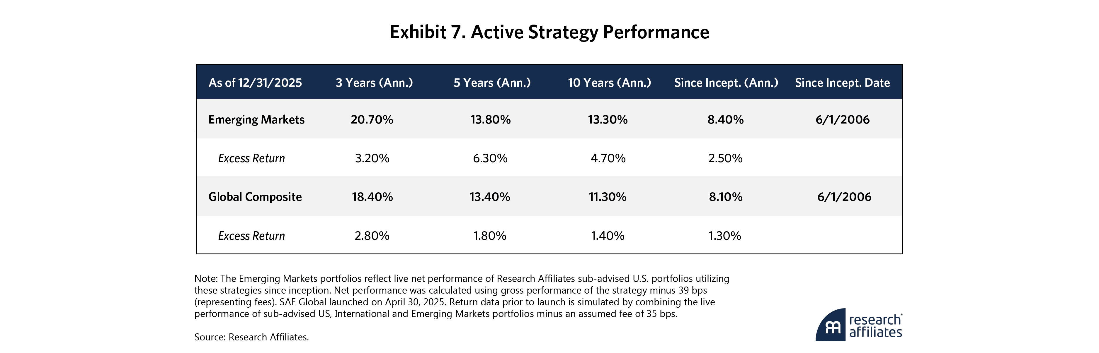 Our Global active value strategies date from 2006, providing tangible corroboration of our research. Exhibit 7 shows the track record of our Global Composite and Emerging Market Equities strategies.