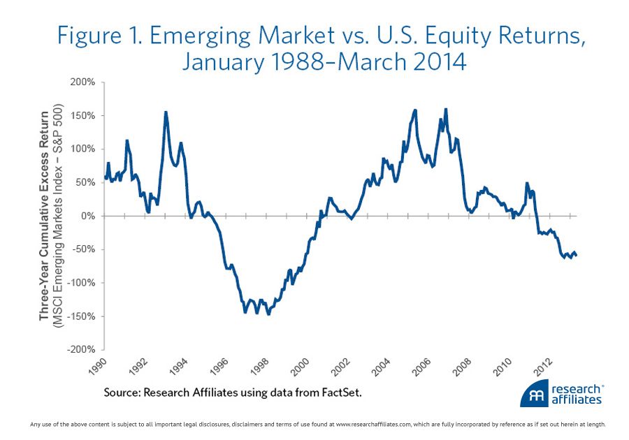 Not since the Asian Contagion and Russian ruble crises of 1997–1998 have emerging market stocks underperformed U.S. stocks by as much as they have over the past three years (see Figure 1). Through March 31, 2014, the three-year cumulative return of emerging market stocks as measured by the MSCI Emerging Markets Index is –8.35%, while that of U.S. stocks as measured by the S&P 500 Index is 50.73%. The ending market value of a portfolio that invested in U.S. stocks three years ago is almost 60% higher than the ending value of an emerging markets portfolio with the same starting date. As painful as they are, the absolute losses that emerging market investors have sustained in recent years are dwarfed by the opportunity cost this gap represents.