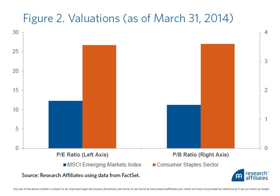 The exciting popular story has been the growth of the emerging markets consumer who has seen a rapid rise in wealth and income. Consumer-related stocks have been one of the top performing emerging market sectors over the last three years, up 26% in absolute terms and beating the broad market by 33%. Investors’ upbeat expectations are reflected in sky-high valuations. The consumer sector is trading at a 27x price-to-earnings (P/E) ratio and a price-to-book (P/B) of 3.6x, both more than twice the corresponding measures for the broad emerging market index (see Figure 2).5 Ironically, investors who are worried about slowing growth in China and other emerging markets are paying premium prices for companies whose earnings may be the most at risk.