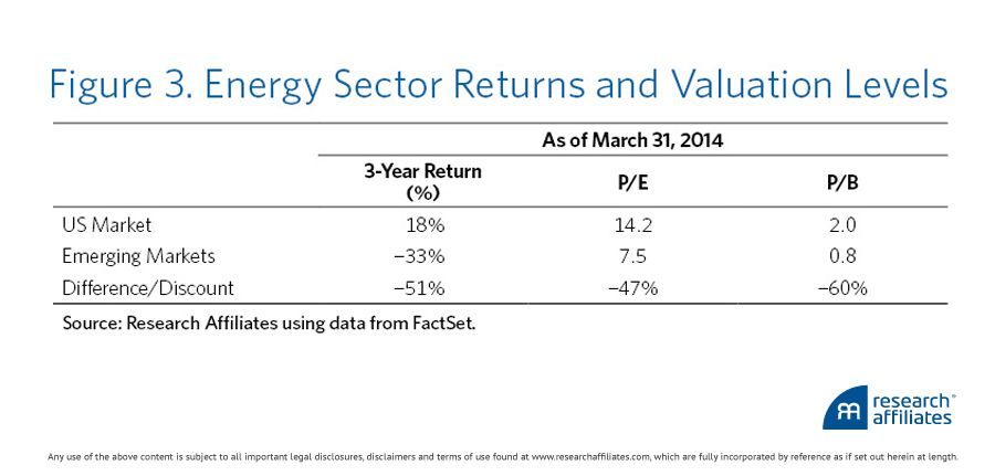 On the flip-side, the weakest emerging markets sector is energy. There is a stark difference between integrated oil companies based in the United States, on one hand, and in Brazil and Russia, on the other. Over the past three years U.S. energy companies’ stock prices rose 18% while the stocks of emerging market energy companies fell 33%. The difference was not due to the enthusiasm for shale oil exploration and production companies in the United States. No, the difference came at the top end: integrated oil companies Exxon Mobil, Chevron, and ConocoPhillips hugely outperformed their emerging market peers Petrobras, Reliance, Gazprom, and CNOOC. Figure 3 shows the variances in energy sector returns and valuation levels in the United States and emerging markets.