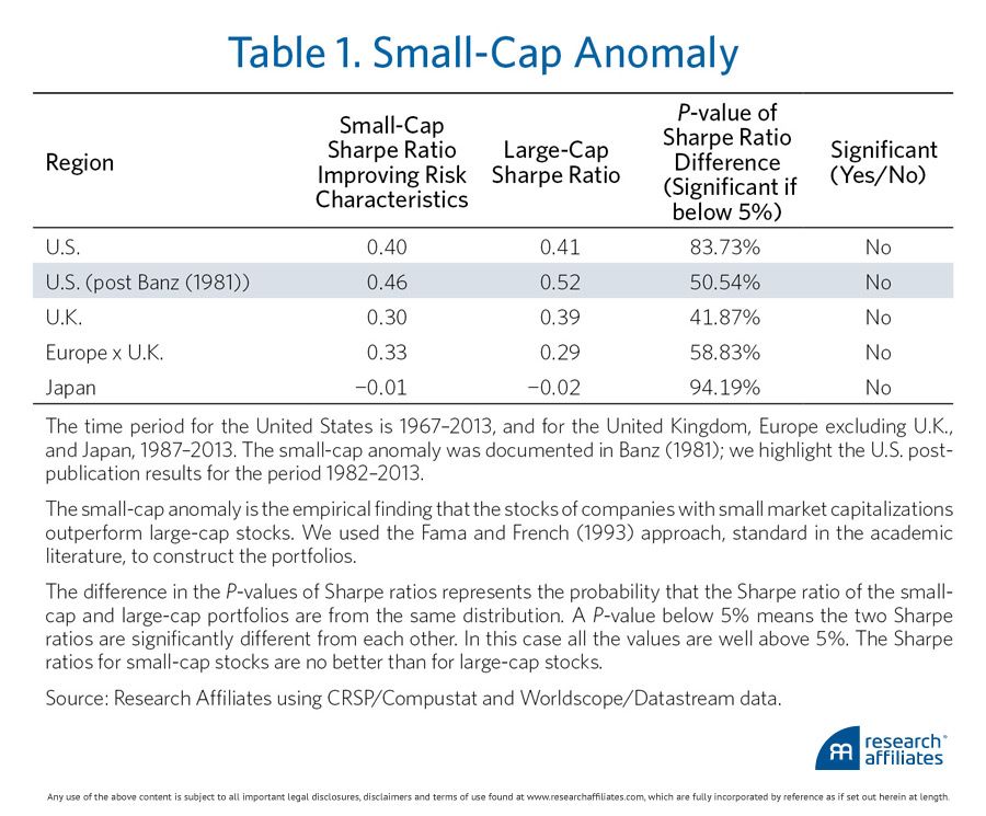 Indeed, that is what we have seen. The small-cap anomaly has not been observed in the United States since the early 1980s and does not exist outside the U.S. dataset (Table 1). This lack of “robustness” out-of-sample led Tyler Shumway and Vincent Warther to re-examine the small-cap anomaly; they concluded that it was likely driven by a mistake in how researchers treated missing data for delisted stocks. Apparently, missing returns for delisted stocks in the CRSP database created a systematic bias in the computed returns for small stocks, which are more likely to face delisting. When this bias is adjusted for, the small-cap anomaly is no longer observed (Shumway and Warther, 1999).