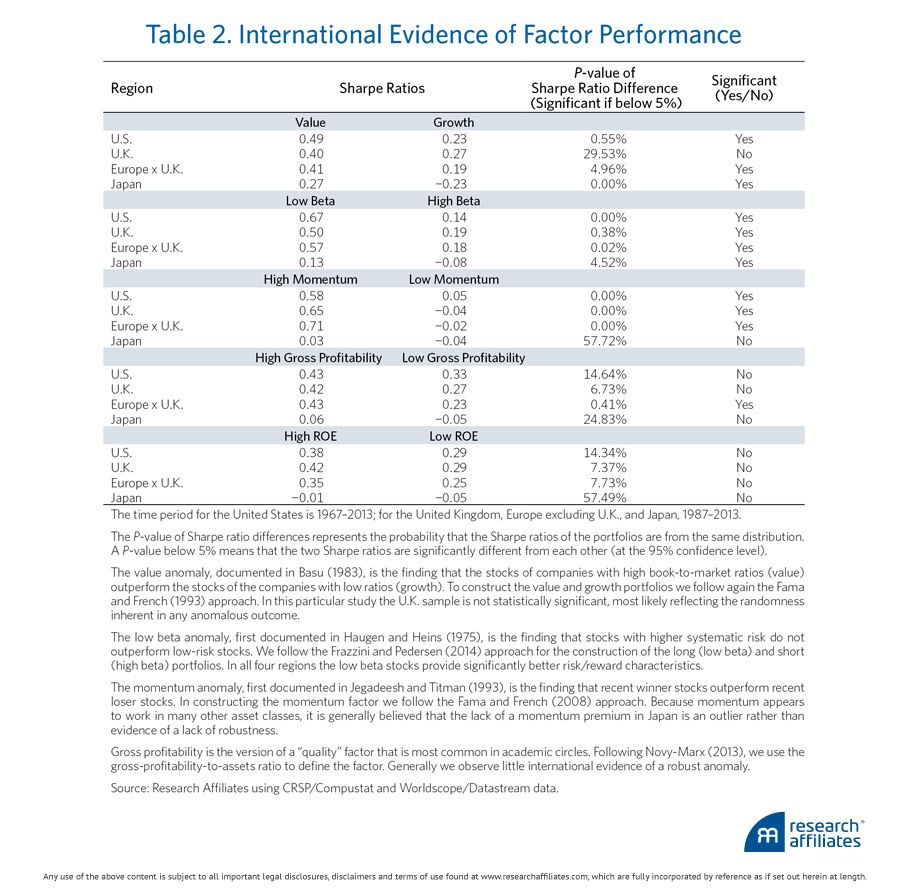 So far, many of the re-examinations of equity factors have used U.S. data exclusively. Our research on factors used both U.S. and non-U.S. data to examine robustness. Our results corroborate what others have concluded using U.S. data. In Table 2, we find that value and low beta are two anomalies which also work in Europe and Japan, while small-cap and other factors such as ROE, profitability, etc., do not work outside the United States. This finding argues for the likelihood that many popular factors are more artifacts of U.S. data than real sources of return premia. Again, we find value, low beta, and momentum to be robust... and we find other factors show significantly less robustness.
