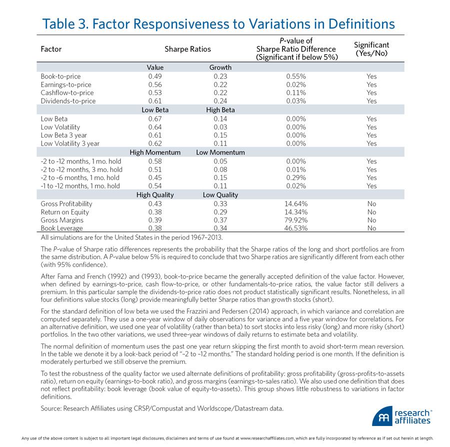 To further examine factor robustness, we explored the change in the measured factor premium due to small changes in the factor definition/construction. For example, we changed the value signal from book-to-price to earnings-to-price and changed the momentum signal from a 12-month look-back to a 6-month look-back. In Table 3, we report the impact on the factor premium arising from reasonable variations in factor definitions.