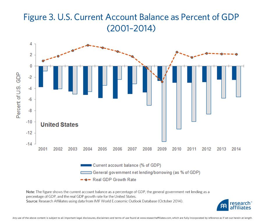 The U.S. current account deficit might also add to concerns about the long-run valuation of the dollar. A current account deficit suggests that the country imports more than it exports and pays for the difference by selling domestic assets to foreign investors. A significant and persistent deficit is therefore unsustainable in the long run. It might require that the dollar depreciate. Figure 3 shows that the U.S. current account is very much in negative territory. The United States has failed to close the current account deficit despite enjoying strong tailwinds from the energy sector and a weaker dollar in 2011 and 2012. This evidence suggests that, in view of the current levels of government borrowing, a strong dollar could be followed by dangerously high current account deficits.