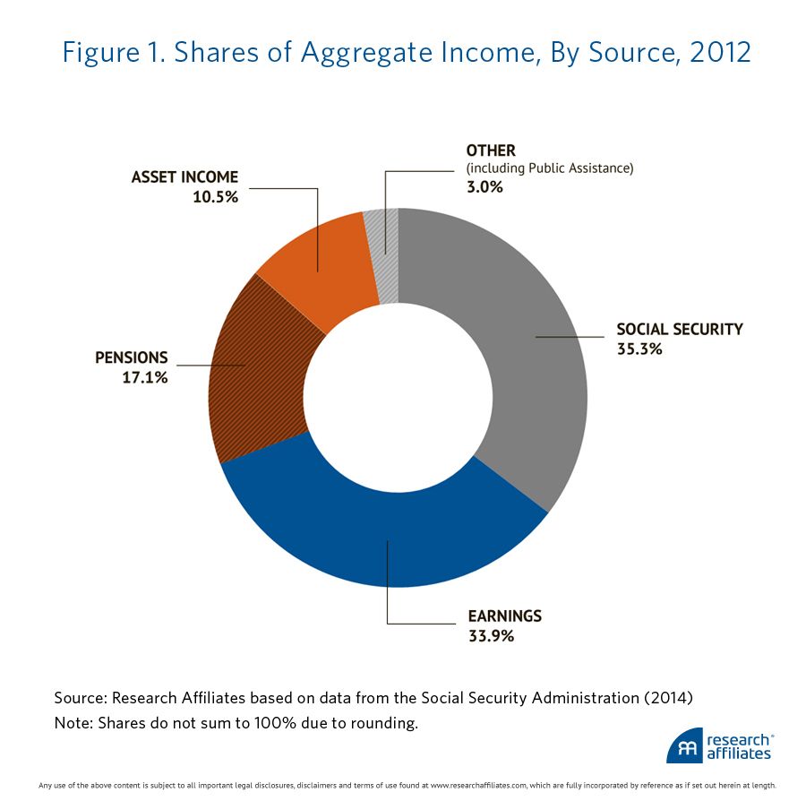 Even if a TDF is the only pension that one owns, income from that pension portfolio makes up only a small portion of total income for people over 65. The majority comes from social security, defined benefit pensions, income earned on other assets, and wages, which together already act as the glidepath that the conventional wisdom advocates. Figure 1 shows the breakdown for the current retirement age population according to the U.S. Social Security Administration.