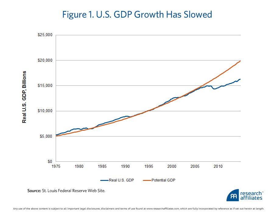 Research Affiliates estimates an average of 1.5% real GDP growth over the next 10 years, while the FOMC and CBO estimate 2.2% and 2.4%, respectively. For more information, visit our asset allocation website.