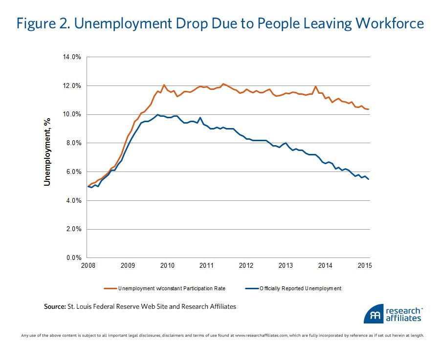 What about unemployment? The official numbers show the U.S. Civilian Unemployment Rate declining from a reported high of 10.0% in 2009 to a comfy 5.5% (the number we used to call “full employment”) as of February 2015.3 But dig deeper. That number masks the fact that the labor participation rate has declined from 66.2% in 2008 to 62.8% now.4 In fact, as Figure 2 shows, most of the drop in the unemployment rate can be attributed to people leaving the workforce rather than job creation. A huge “shadow inventory” of unemployed workers hangs over the labor market, unrecognized in the official numbers.5 An improving economy could encourage many non-participants to return to job-seeking status. If the labor participation ratio were to return to its 2008 level, today’s unemployment rate would sit at 10.4%! This shadow inventory helps explain the tepid wage growth we have seen even as the job market becomes tighter, and it will likely continue to keep a lid on wage growth going forward.