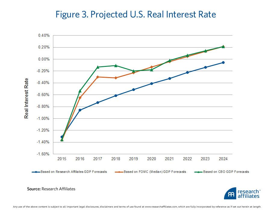 Macroeconomic theory gives us some guidance. At Research Affiliates, we model the equilibrium real rate as a function of two key variables: country-specific real GDP growth and a time preference factor that favors current consumption over future consumption. If these factors represent the supply side and demand side, respectively, for an intertemporal transfer of wealth, then the equilibrium rate of interest is the price at which supply will equal demand.