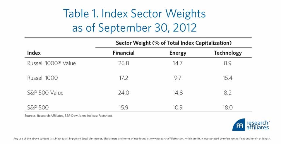 The conventional style indices have two important characteristics. First, their active shares relative to the market benchmark are dominated by industry bets. In traditional value indices, growth oriented industries are represented only to the extent value stocks have growth characteristics. The resulting indices are unrepresentative of the underlying economic exposure because they are poorly diversified from an industry concentration perspective. In particular, a quick examination of traditional value indices will find large overweights in financial and energy stocks, made possible in part by underweight positions in technology stocks. The S&P 500 Value Index and the Russell 1000® Value Index have significantly more exposure to financial and energy stocks, and less to technology stocks, than the corresponding broad market indices. (Table 1.)