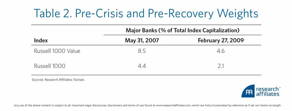 Second, although traditional value style indices are reconstituted once a year, they cap-weight the stocks that are selected into their value baskets. Consequently, the weights of the stocks in a value index fluctuate with prices. For example, prior to the Global Financial Crisis, many of the large banks became expensive relative to their own historical valuation ratios. The cap weighting scheme meant that these expensive banks also took on very dominant weights within the value index just prior to the banking sector crisis. Similarly, just at the nadir of the crisis, when banks were trading at historically low valuation multiples, they also took on substantially reduced weights in the value index before the financial stock recovery of 2009. Table 2 displays the weights of major bank stocks before and after the financial crisis.
