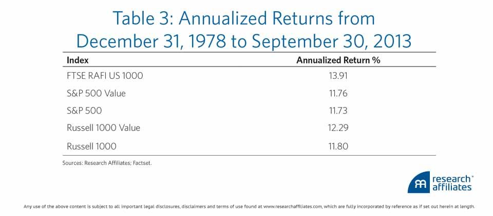 The Fundamental Index’s approach to value investing thus results in approximately 200 bps of historical outperformance3 substantially higher than the traditional value indices’ value-added returns. In the period from December 31, 1978 through September 30, 2013—the longest period for which data are available—the annualized return of the FTSE RAFI U.S. 1000 Index was more than 200 bps higher than the returns of the S&P 500 Index and the Russell 1000 Index, respectively. By contrast, the S&P 500 Value Index beat the S&P 500 by approximately 3 bps and the Russell 1000 Value Index surpassed the Russell 1000 Index by 49 bps. (Table 3.)