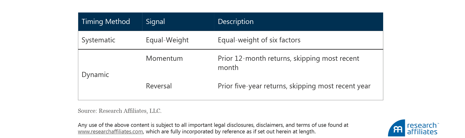 The following timing methods are employed across factors: