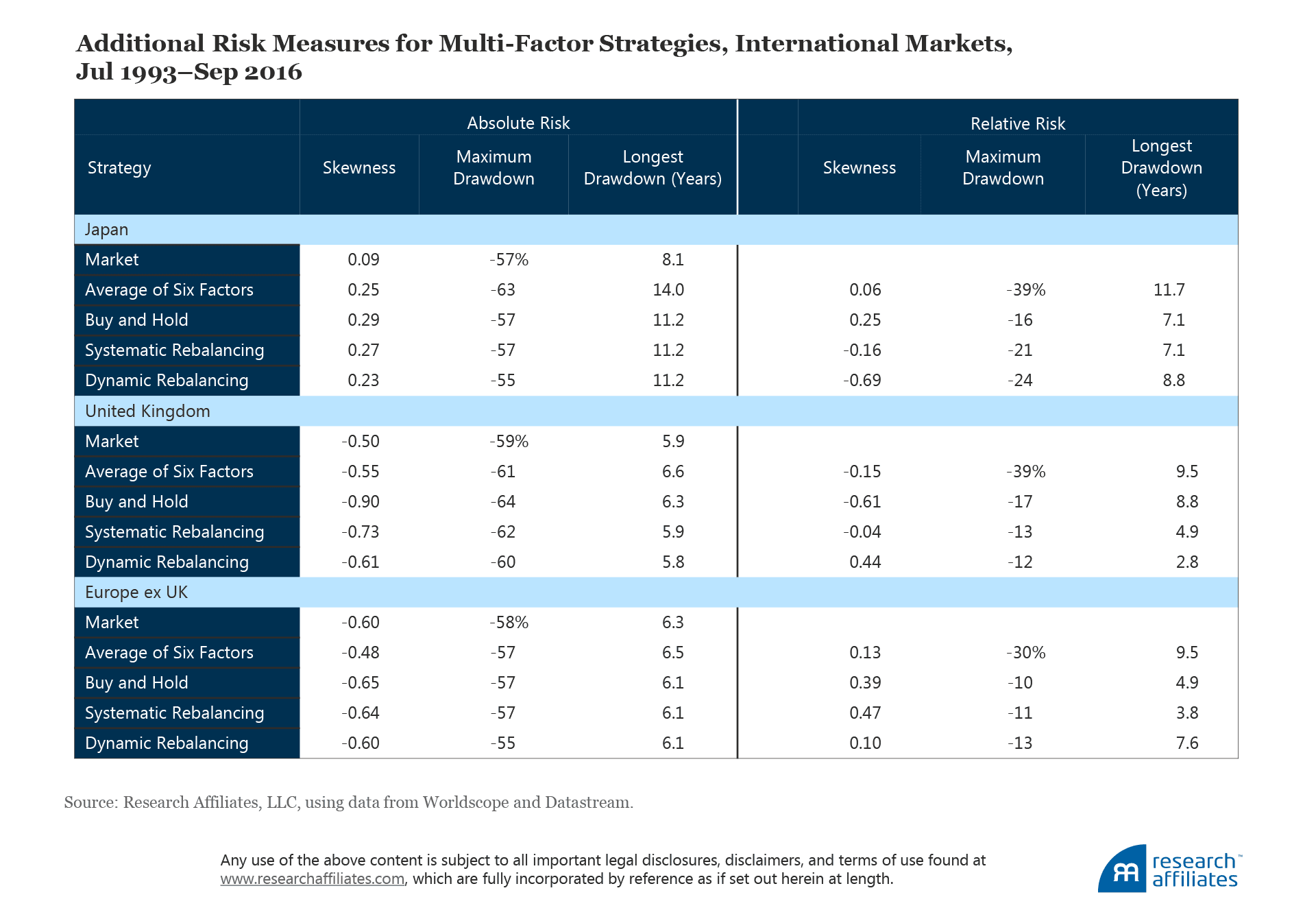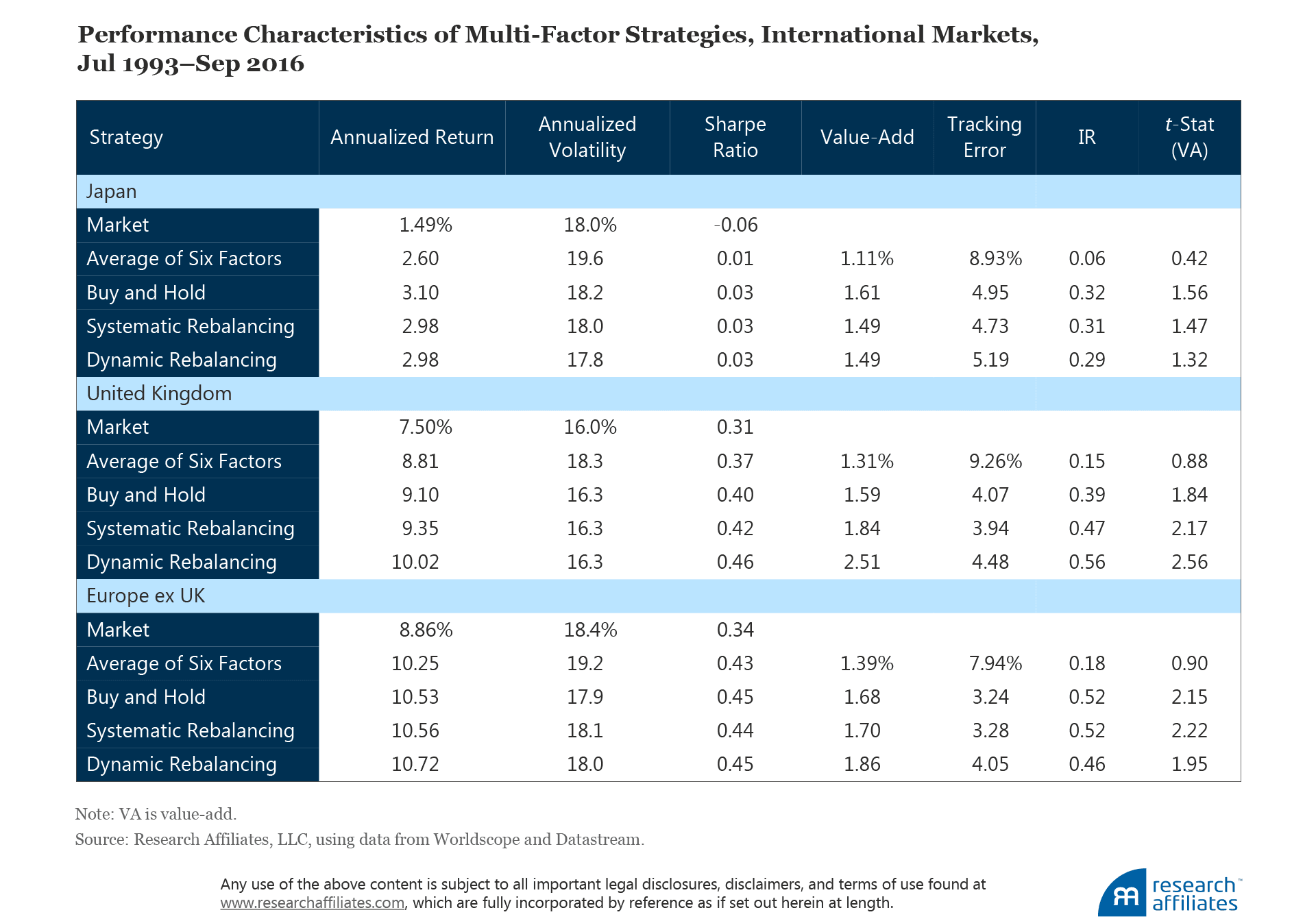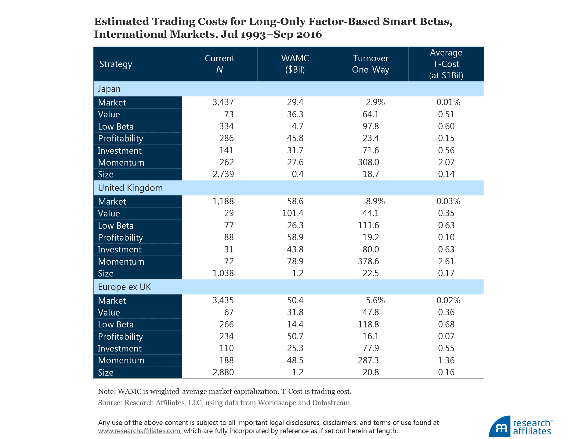 Nearly a full percentage point in return, however, is produced by dynamic rebalancing relative to the average individual factor strategy, with value-add rising from 2.19% to 3.16%. The extra value added from dynamic rebalancing relative to systematic rebalancing is also substantial, rising from 2.45% to 3.16%. If we consider trading costs, however, the improvement in value-add erodes slightly. Appendix E provides our method for estimating trading costs when applying the three weighting methods used in creating the diversified multi-factor smart beta strategies in the United States, Japan, United Kingdom, and Europe ex UK.