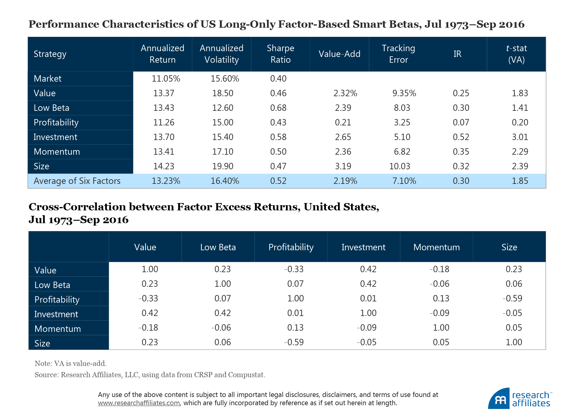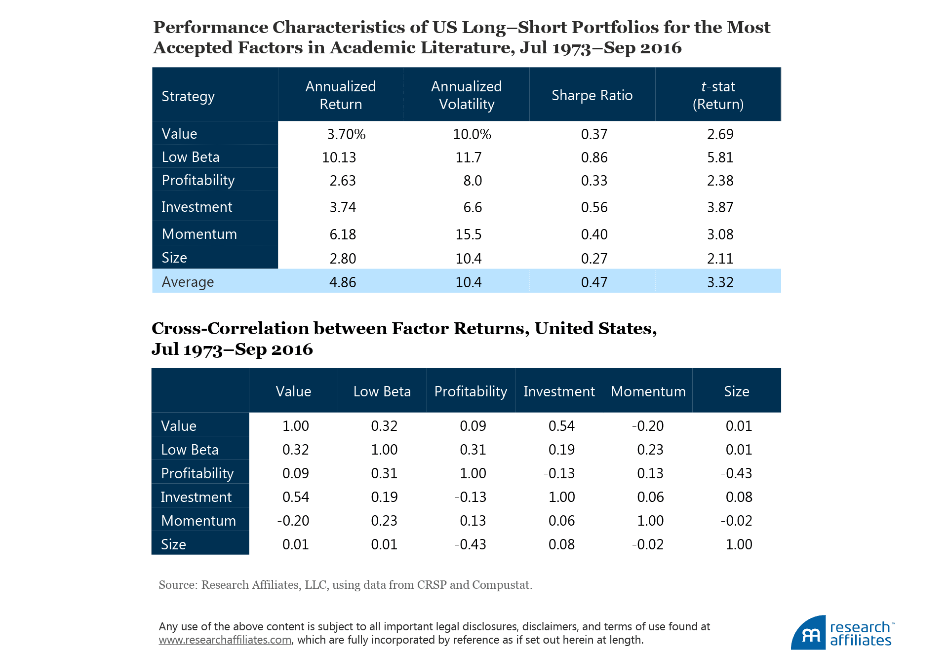 We construct these six factor portfolios in accordance with widely accepted academic practice. We summarize our factor portfolio construction method in Appendix A. All six factors demonstrate both statistically and practically significant returns. The average annualized factor return in the United States over our study period July 1973–September 2016 is 4.86%. The correlations across these factor returns are predominantly low or negative, with an average cross-correlation of 0.08, suggesting they are independent and thus able to provide strong diversification benefits.