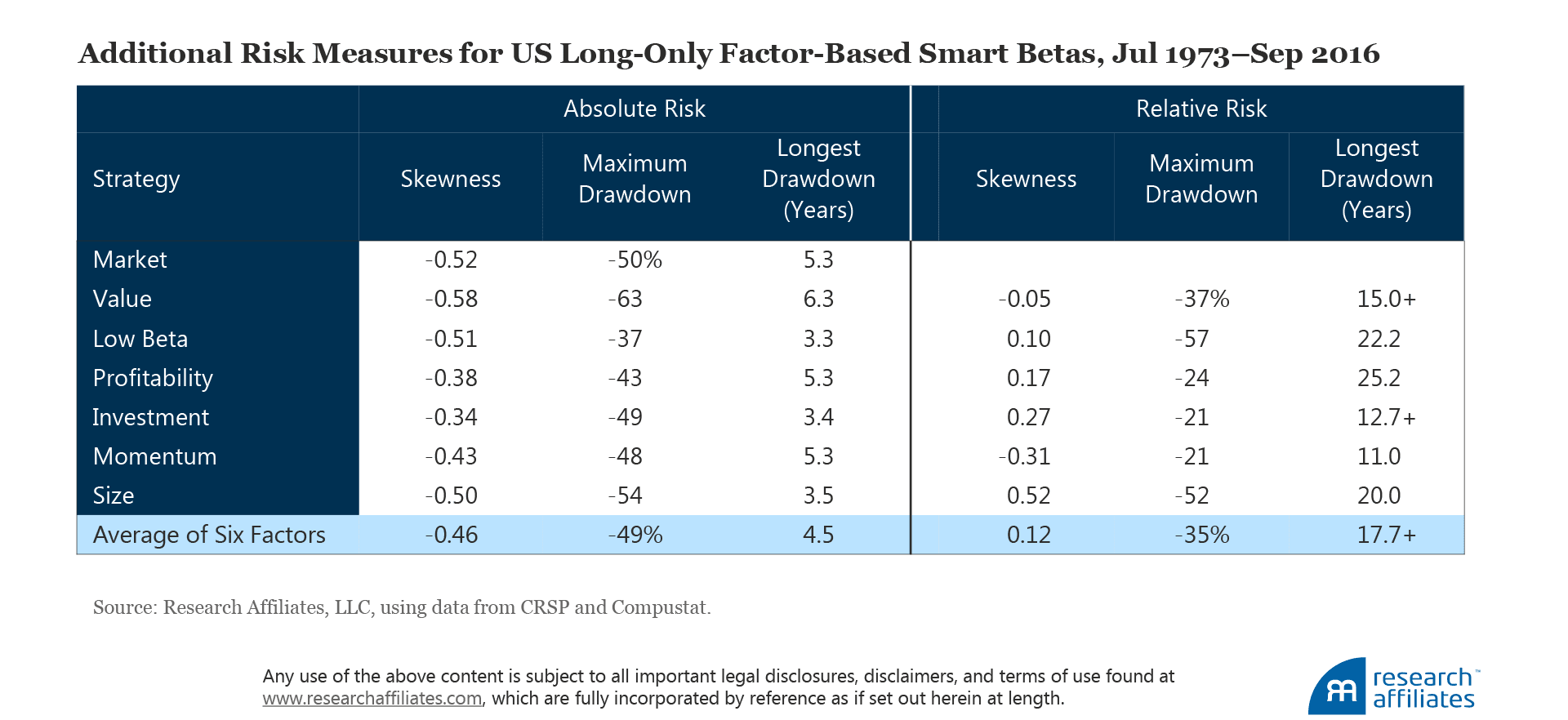 Correlations across our six smart betas are generally low and sometimes negative. Nine of the 15 strategy correlations of our six smart betas in the United States are near zero or negative, with an average excess return cross-correlation of 0.02. As with the six factors, these factor-based strategies capture independent sources of return and should provide strong benefits from diversification.