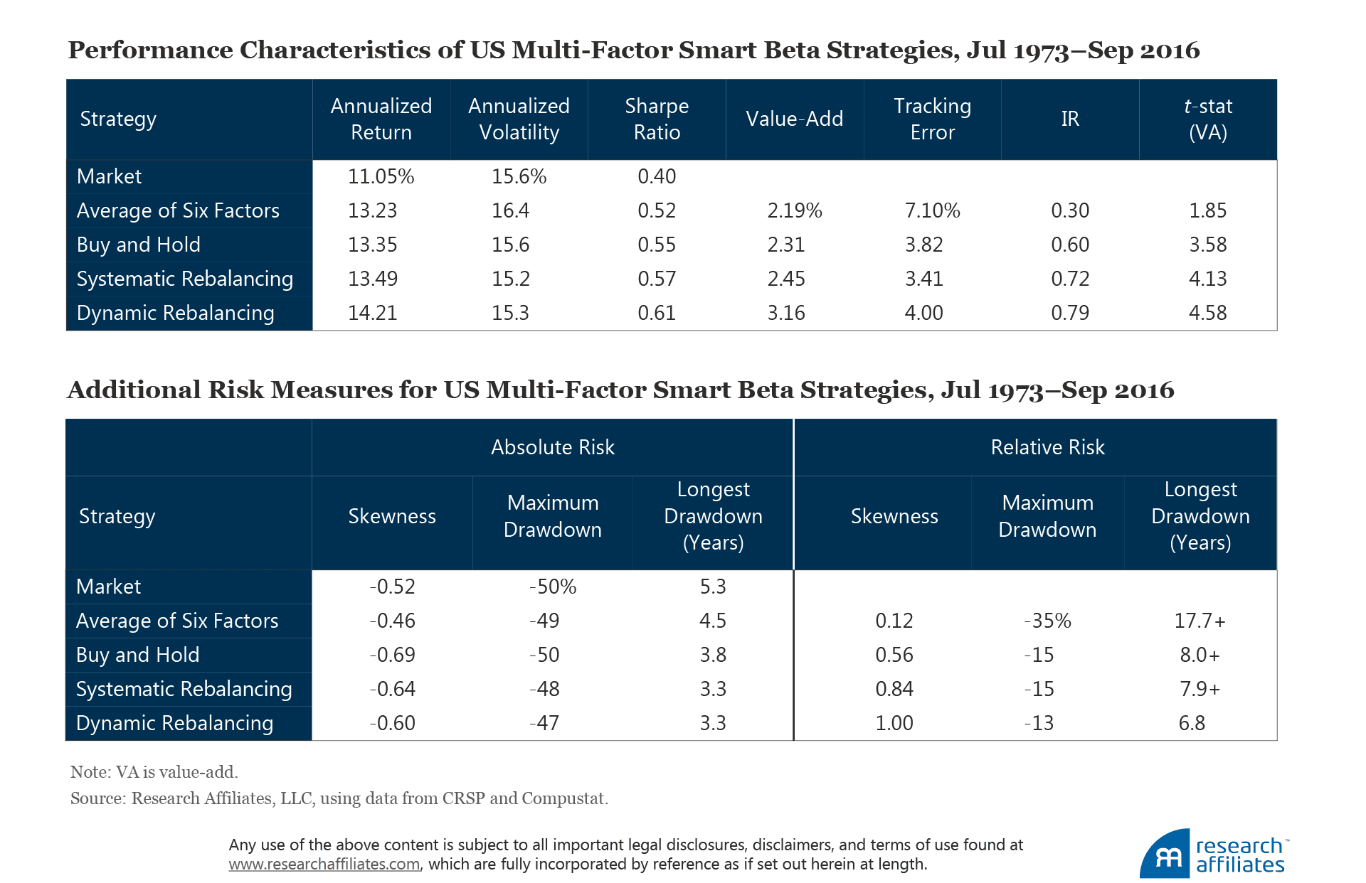 You can outperform the market by investing in factor-based smart beta strategies, and you can obtain this outperformance with a smoother ride—that is, with substantially lower tracking error and shorter periods of underperformance—when you invest in a diversified portfolio of smart betas. In addition, our findings indicate you should benefit from the highest return and value-add, highest Sharpe and information ratio, and lowest drawdown and shortest period of underperformance if you dynamically rebalance your diversified portfolio of smart betas.2 Multi-factor equity investing combined with either dynamic or systematic rebalancing is a reliable strategy for outperforming the market without the burden of excessive volatility. We believe the evidence shows a smoother path to outperformance is paved through multi-factor smart beta investing.