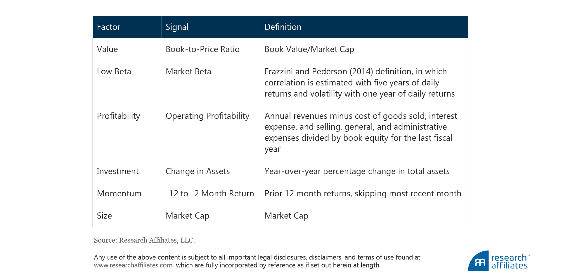 Our research leads us to conclude that only a handful of factors represent genuine future return opportunities—strategies with the potential to outperform in the decades ahead. Following the findings of Fama and French (1993, 2012, 2015), we include in this group of six the four factors in their current model (looking beyond the market factor)—value, profitability, investment, and size—as well as low beta and momentum, two factors widely deemed robust in academic publications (Frazzini and Pedersen, 2014, and Carhart, 1997).