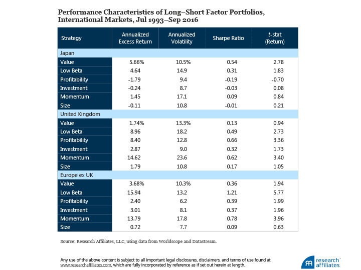 In Appendix B we replicate the same six factor portfolios in three international markets—Japan, the United Kingdom, and Europe ex UK—over the period July 1993–September 2016. We choose these markets for their lengthy history and homogeneity of corporate domicile. Whereas not all factors display positive returns in all geographies, taken as a group the factors do show consistently strong out-of-sample returns. We intend to elaborate on our research validating these six factors in future publications; many of our detailed research findings on these equity factors are beyond the scope of this article.
