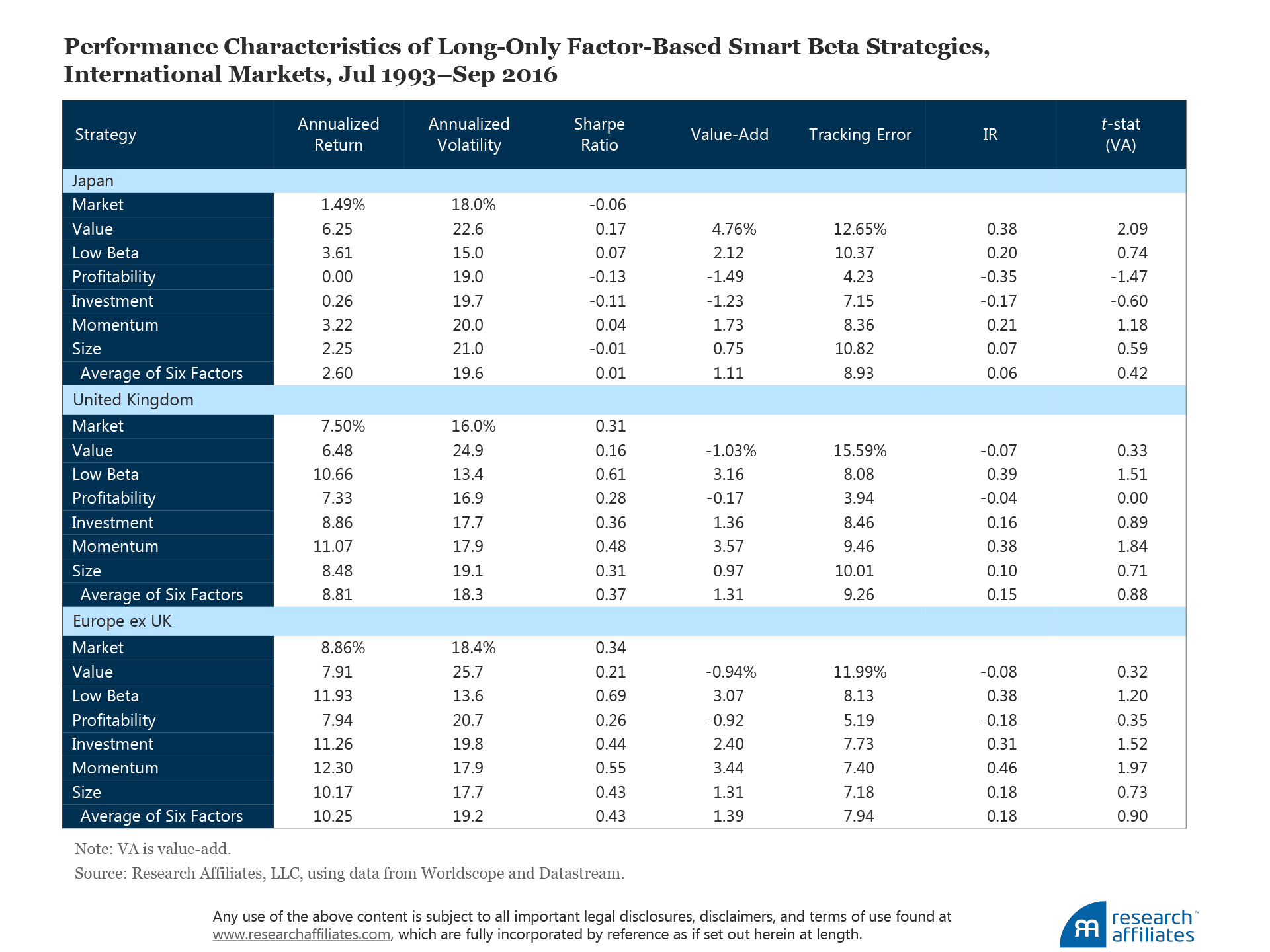 Out-of-sample robustness tests in Japan, United Kingdom, and Europe ex UK provide confirming, if somewhat weaker, evidence. Most strategies earn an excess return over the market benchmark, but in each of the international markets we study, a couple of the factor-based smart beta strategies generate mildly negative value-add. The average value-add of the six strategies remains well above 1.00% a year in all three out-of-sample geographies.