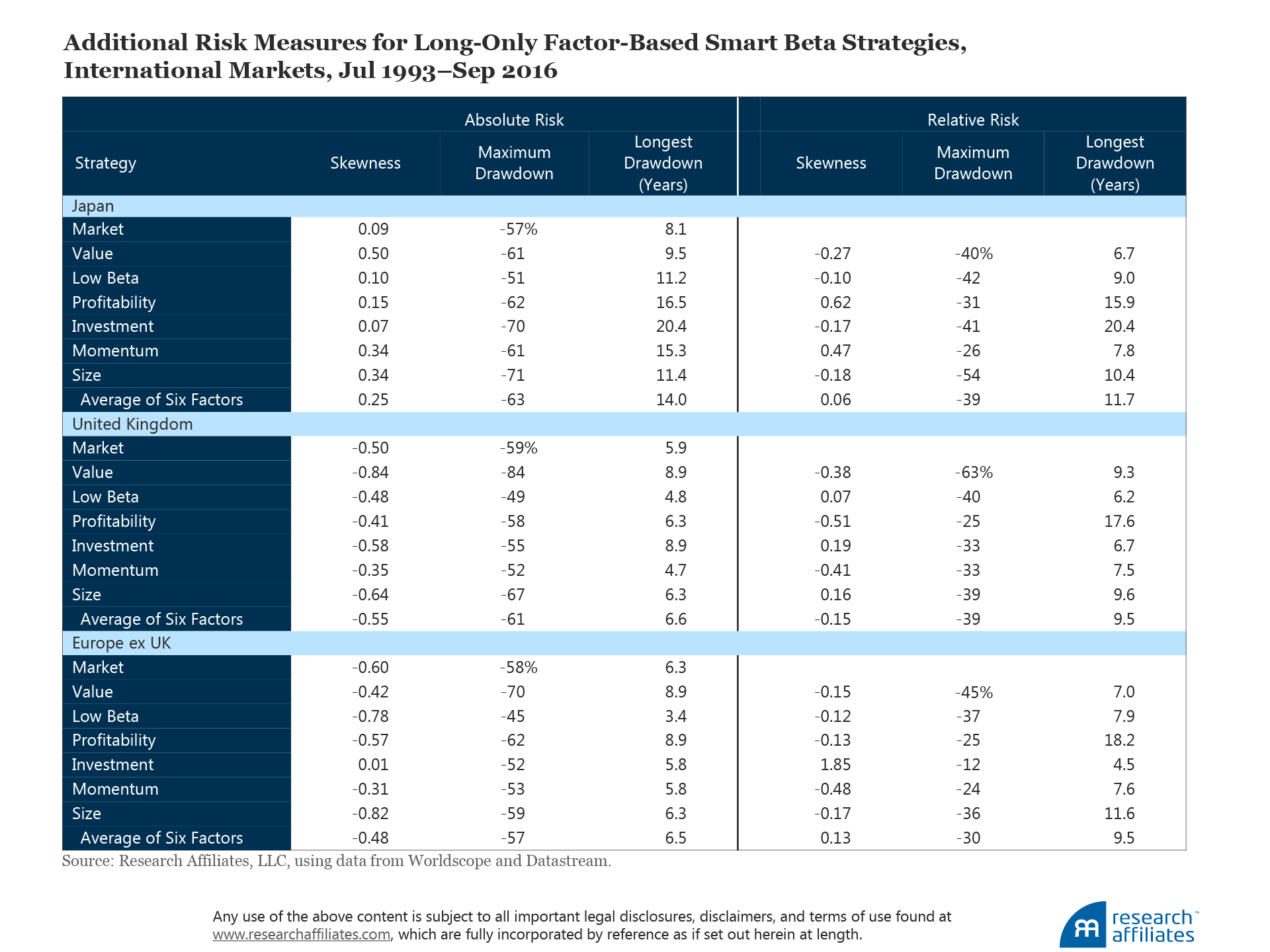 For international factor portfolios, we use the universe of stocks from the Worldscope/Datastream database. We define the international large-cap equity universe as stocks with market capitalization in the top 90% by cumulative market-cap within their region, where regions are defined as Japan, United Kingdom, and Europe ex UK. The small-cap universe is defined as the bottom 10% by cumulative market-cap. The international data extend from July 1993 to September 2016.