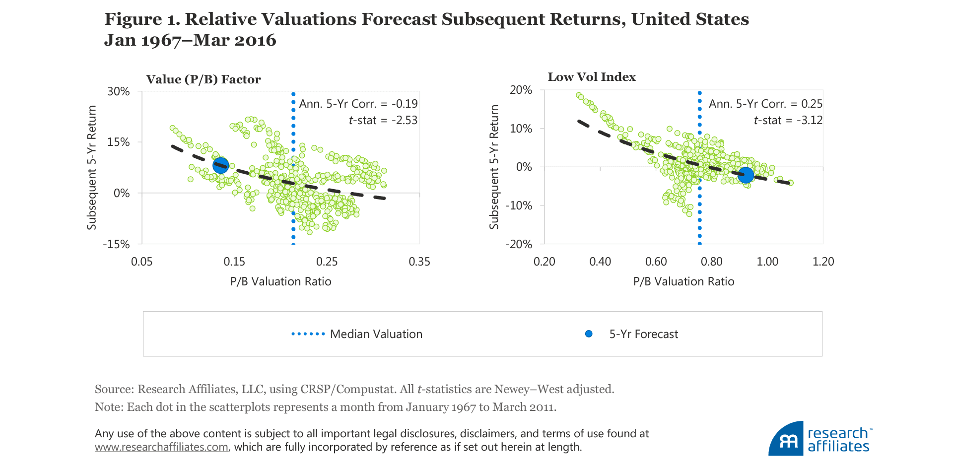 We can easily see the link between valuation and subsequent performance on a scatterplot created using these two variables. The two scatterplots in Figure 1 are from Arnott, Beck, and Kalesnik (2016a) and are examples of the historical distributions of valuation ratios and subsequent five-year returns for a long–short factor, the classic Fama–French definition of value, and for a smart beta strategy (the low volatility index), as of March 31, 2016. In June 2016, we identified the former as the cheapest factor, relative to its history, and the latter as the most expensive strategy, relative to its history.