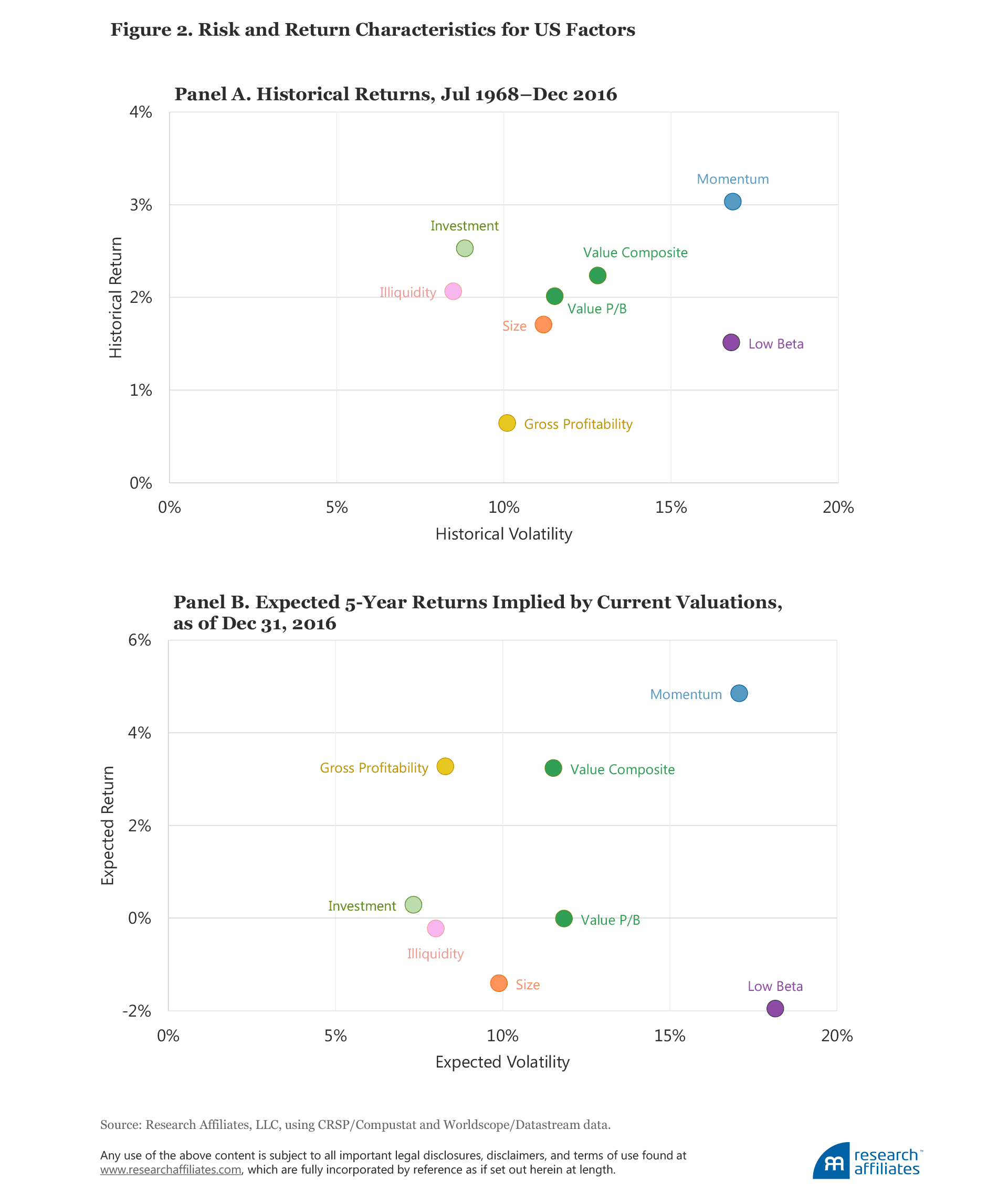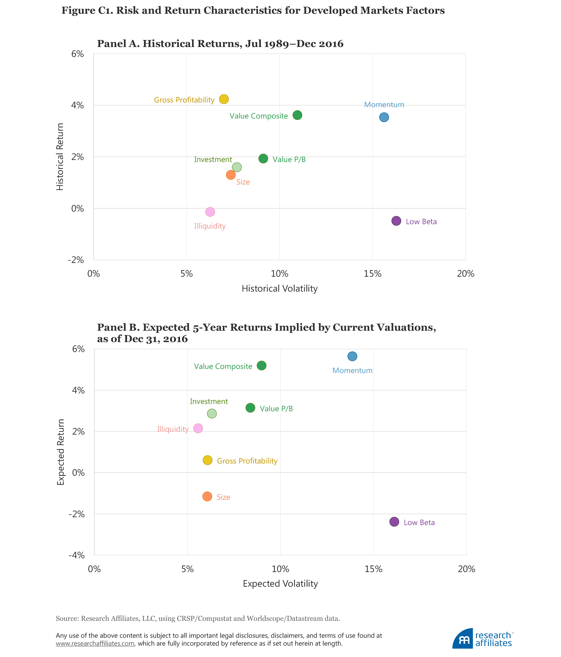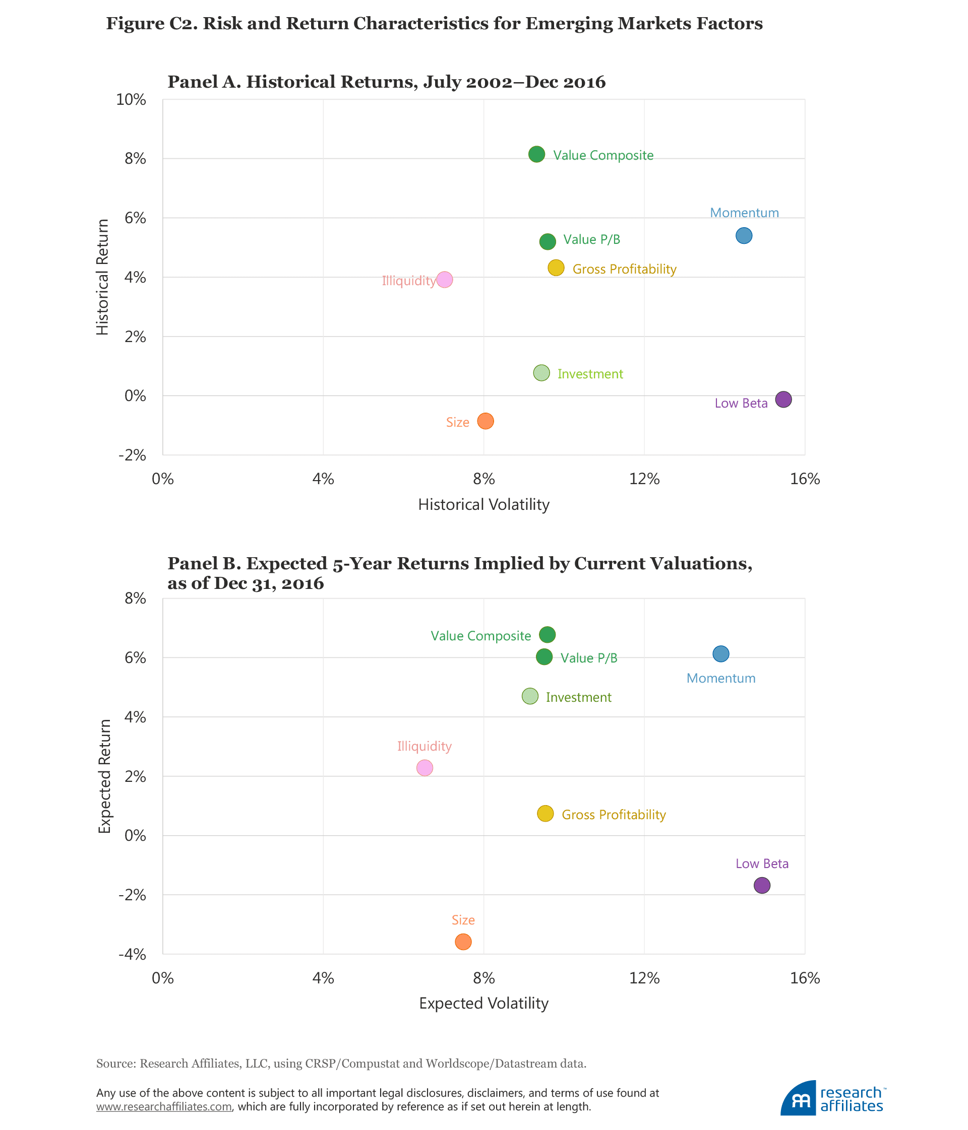 Figure 2, Panel A, plots the historical excess return and historical volatility, and Panel B the five-year expected return and expected volatility, at year-end 2016 for a number of common factors in the US market, constructed as long–short portfolios. We provide the same data for the developed and emerging markets in Appendix C. (The results can also be found in tabular form later in the article in Table 2, Panel A.) The alpha forecasts are plotted against the projected volatilities, which are estimated as an extrapolation of recent past volatility.7