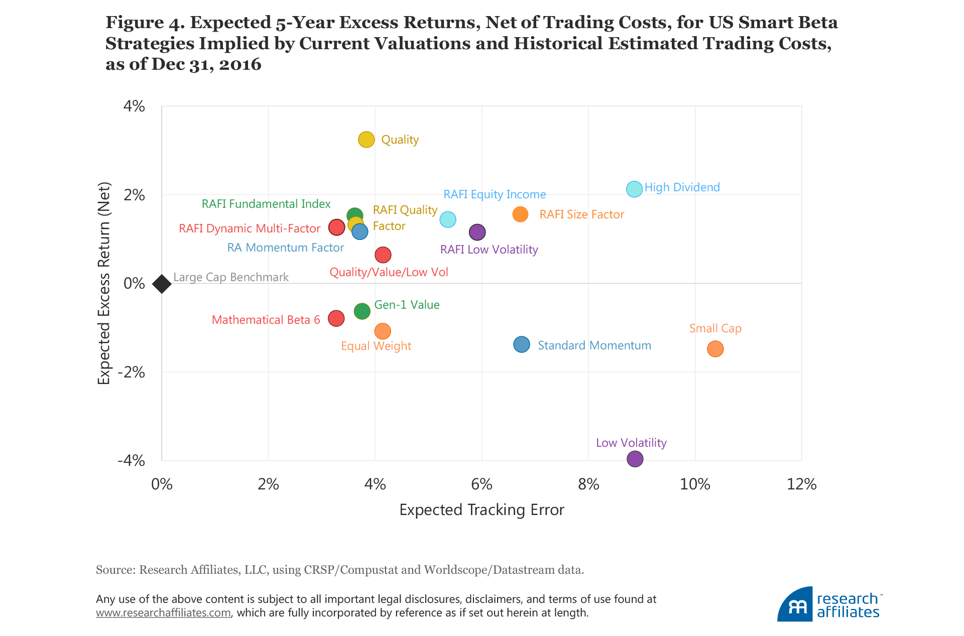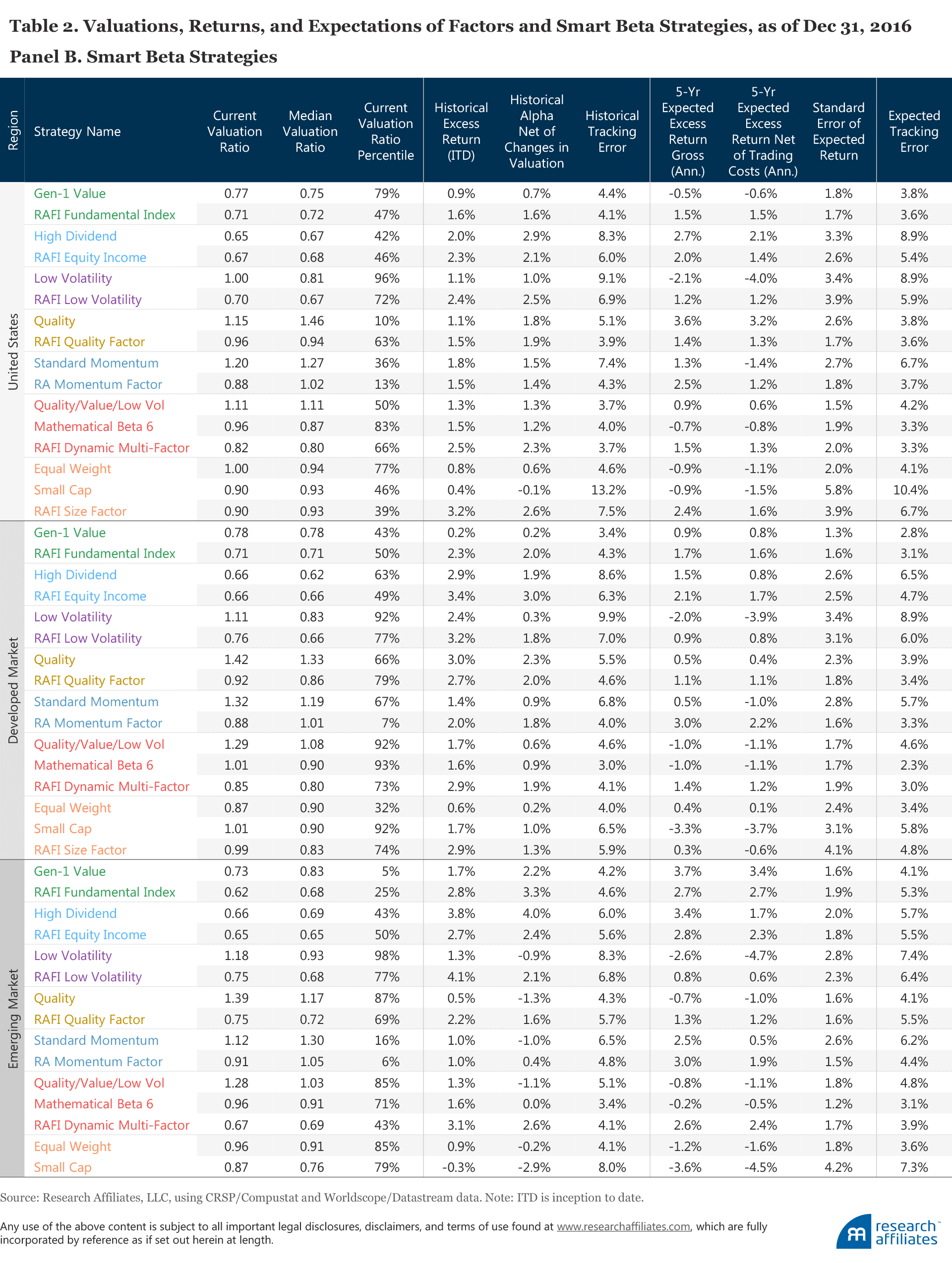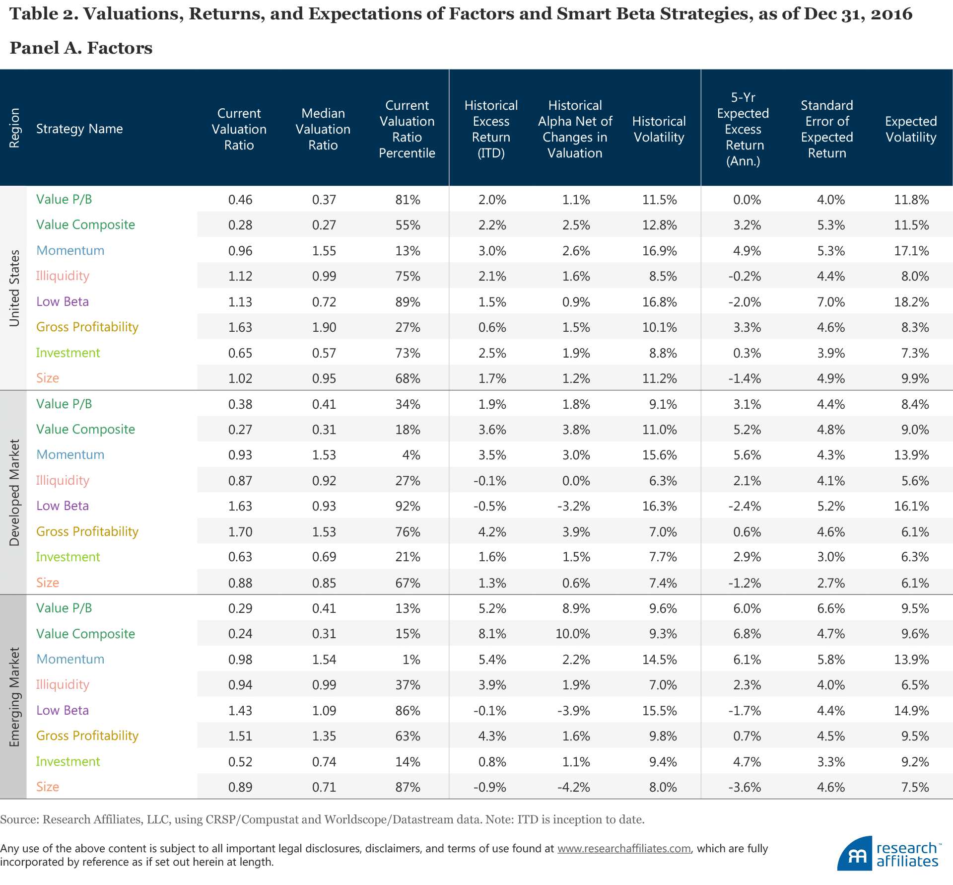 Smart beta strategies with negative forecasted alphas. Like our findings regarding the low beta factor, we project that the low beta and low-volatility strategies will underperform their respective benchmarks across all regions. Even after some pretty disappointing results during the second half of 2016, these strategies still trade at premium valuations. This doesn’t mean that investors should avoid them altogether! They will reduce portfolio volatility and are complementary to many other strategies.
