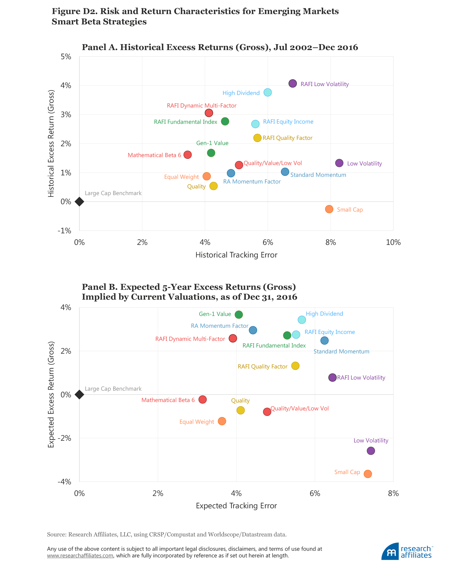 Finally, the RAFI Size Factor strategy is projected to have a much higher return in the US and developed markets than other small cap–oriented strategies. It’s important to note that “RAFI Size Factor” is not the same as the RAFI 1500 for small companies, but rather is a blend of four factor-tilt strategies, each formed within the universe of small-cap stocks: small value, small momentum, small low volatility, and small quality (a factor that combines profitability and investment metrics). Instead of trying to capture the Fama–French SMB (small minus big) factor, one of the factors with weak long-term empirical support, RAFI Size Factor tries to capture other well-documented factor premia within this segment of small stocks having higher risk and higher potential for mispricing.