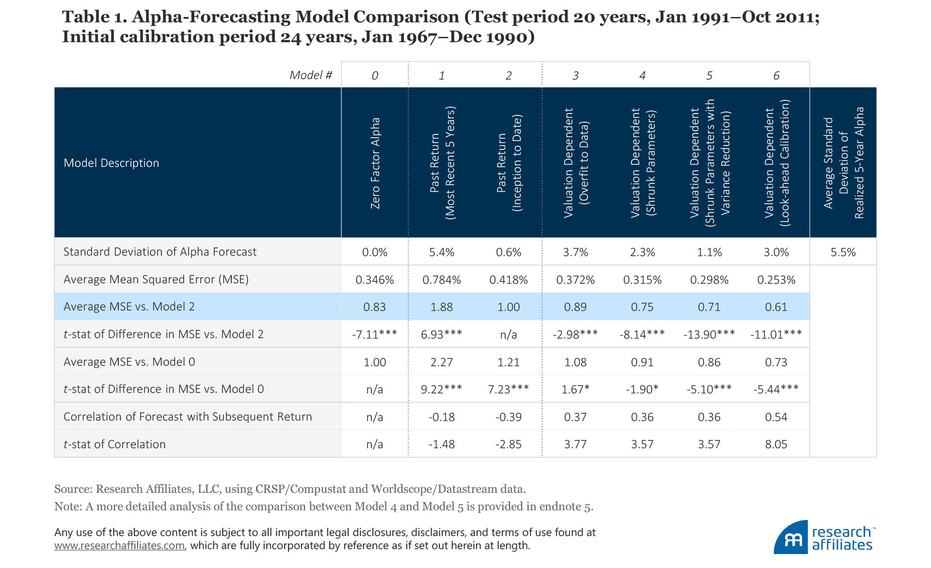 These criteria provide useful metrics for us to compare different alpha-forecasting models. We select six models for comparison. One model assumes an efficient market: no factors or strategies have any alpha. Two of the models use only past performance and ignore valuations, and four of the models are based on valuation levels relative to historical norms.