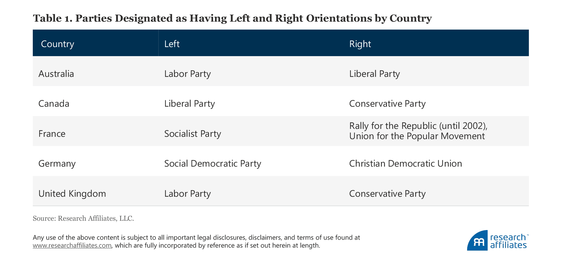 The countries we study are governed by different political systems and have varying political party spectrums and definitions. Thus, cross-country comparisons may be complicated, and any conclusions we may attempt to draw for the sample as a whole may be misleading. For example, it is sometimes whimsically observed—and not entirely inaccurate—that conservatives in Canada are to the left of liberals in the United States, and it’s quite clear that European liberals and North American liberals are very different. The extent to which these differences exist is beyond the scope of this article, but the potentiality presents another reason for skepticism that the relation between politics and market returns is stable across countries.
