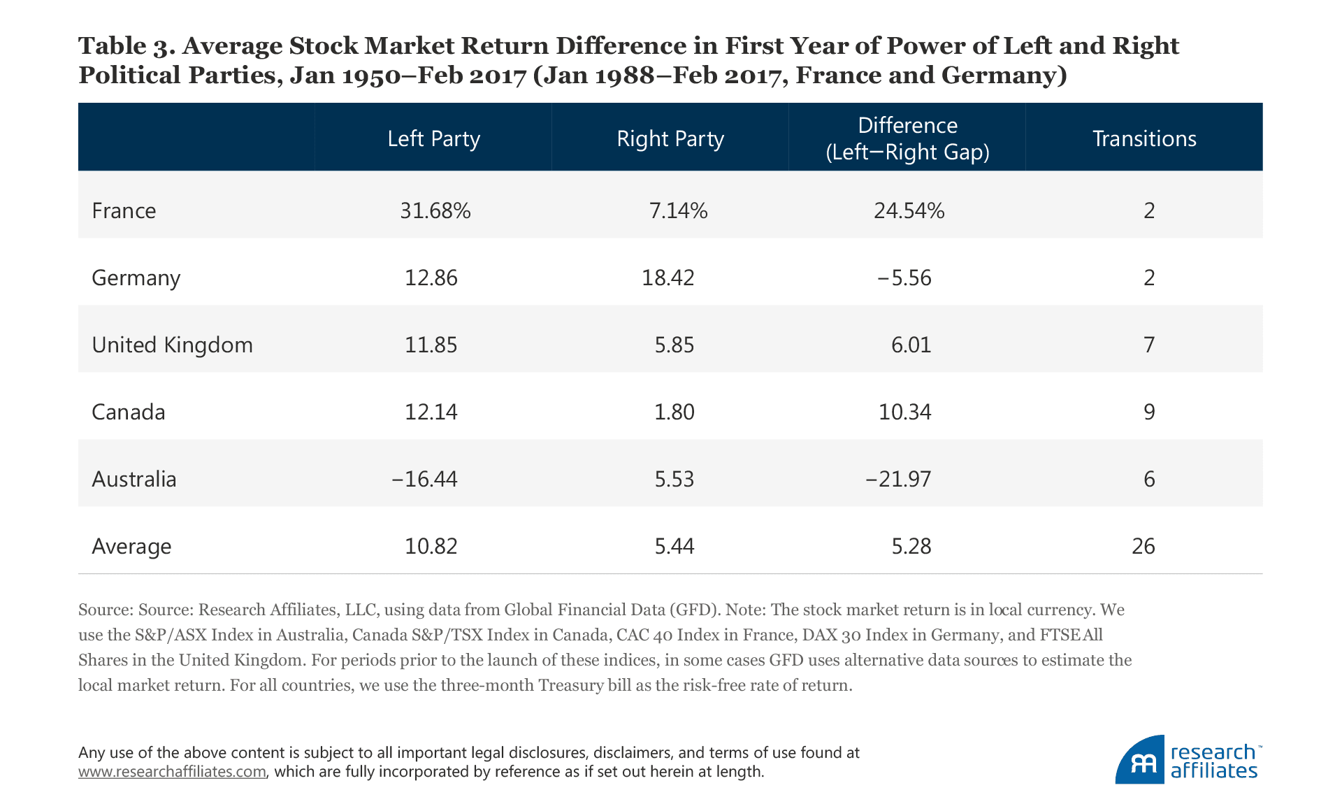 When measured in the first year of party rule, returns are higher following the left party coming to power in Canada, France, and the United Kingdom. In contrast, the ascension of the right party is associated with greater returns in Australia and Germany. Again, the evidence is far too noisy to support the hypothesis that any systematic factor is impacting stock returns as a result of either political party transitioning to or retaining power. The 36.88% return gap observed in the United States once again looks like a statistical outlier rather than the rule.