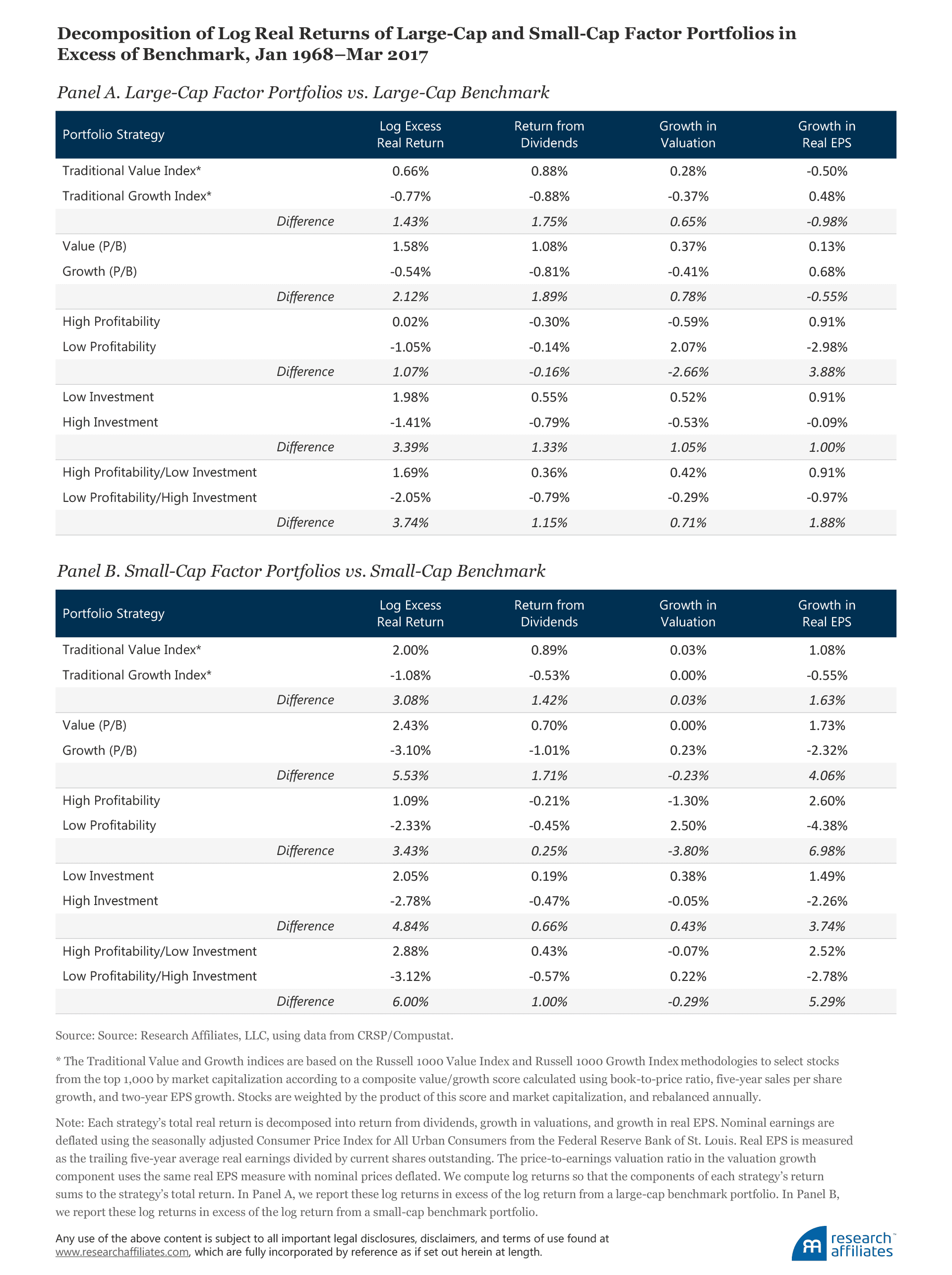 11. This may seem counterintuitive, however, considering the return decompositions of the large-cap and small-cap universes, which we provide in the appendix. We find that within the large-cap universe, the earnings growth contribution is as expected: positive for growth and negative (or at least negligible) for value. Within the small-cap universe these relationships are reversed, and the small-cap effect dominates the blended portfolios in the table “Decomposition of Log Real Returns of Large-Cap and Small-Cap Factor Portfolios in Excess of Benchmark.” One possible explanation for the negative contribution from earnings growth among small growth companies is that these small companies tend to have more uncertain and volatile earnings. If investors over-extrapolate future earnings growth of these small firms, their stock price will be bid up relative to their book value and realized earnings growth will subsequently create a negative drag on returns as earnings mean revert from an unsustainable level. For small-cap value companies, depressed earnings rebound from a smaller base over the holding period, so that earnings growth contributes positively to returns.
