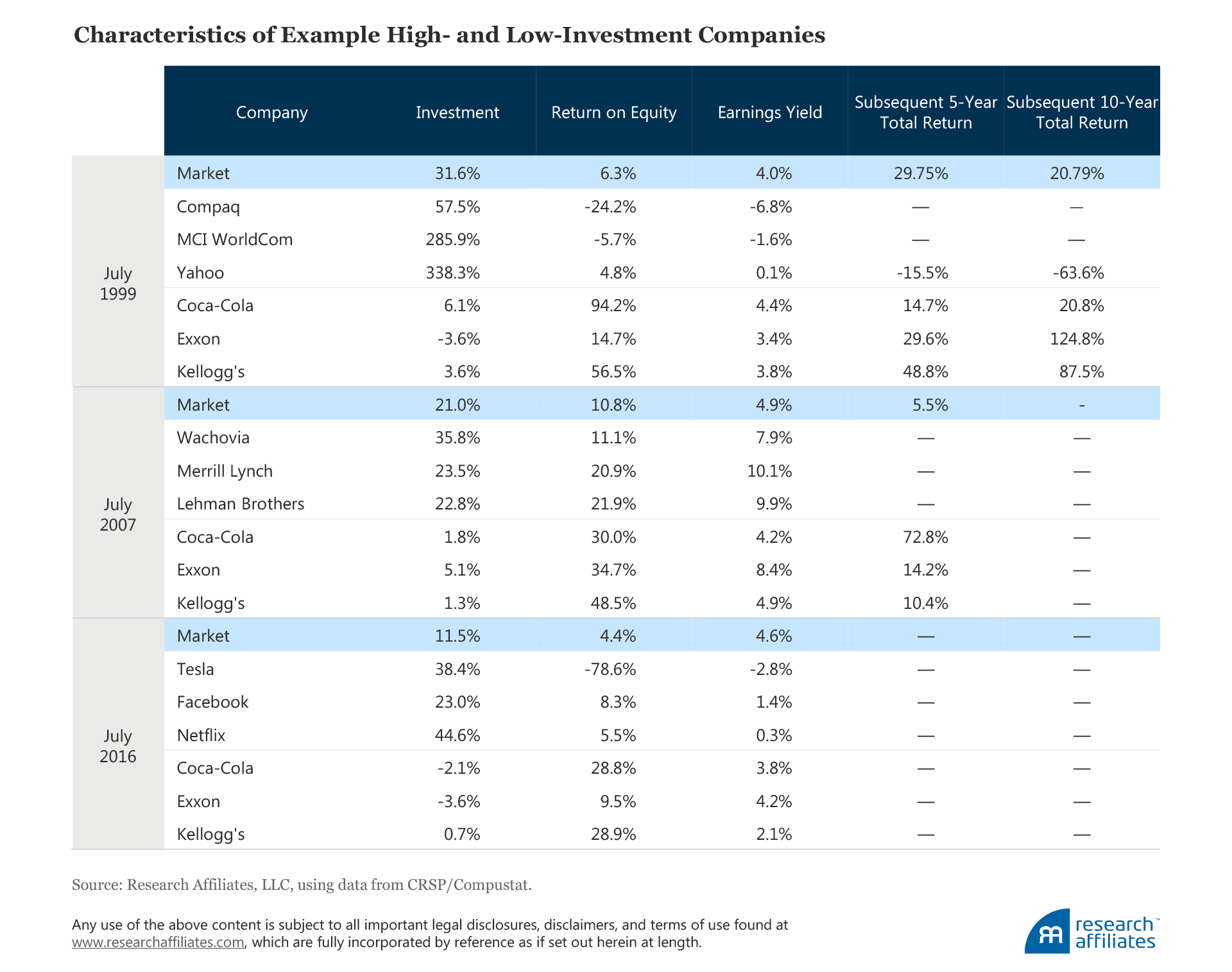 More recently, Tesla, Facebook, and Netflix are examples of companies with an aggressive level of investment combined with a low return on capital. Are these companies poised to be the next Apple and Google, or will they go the way of Compaq, Lehman, and WorldCom? We have no specific information about the future prospects of these high-flying market darlings, but history teaches that, on average, companies with a low return on capital, paired with aggressive investment, have provided poor returns to investors.8