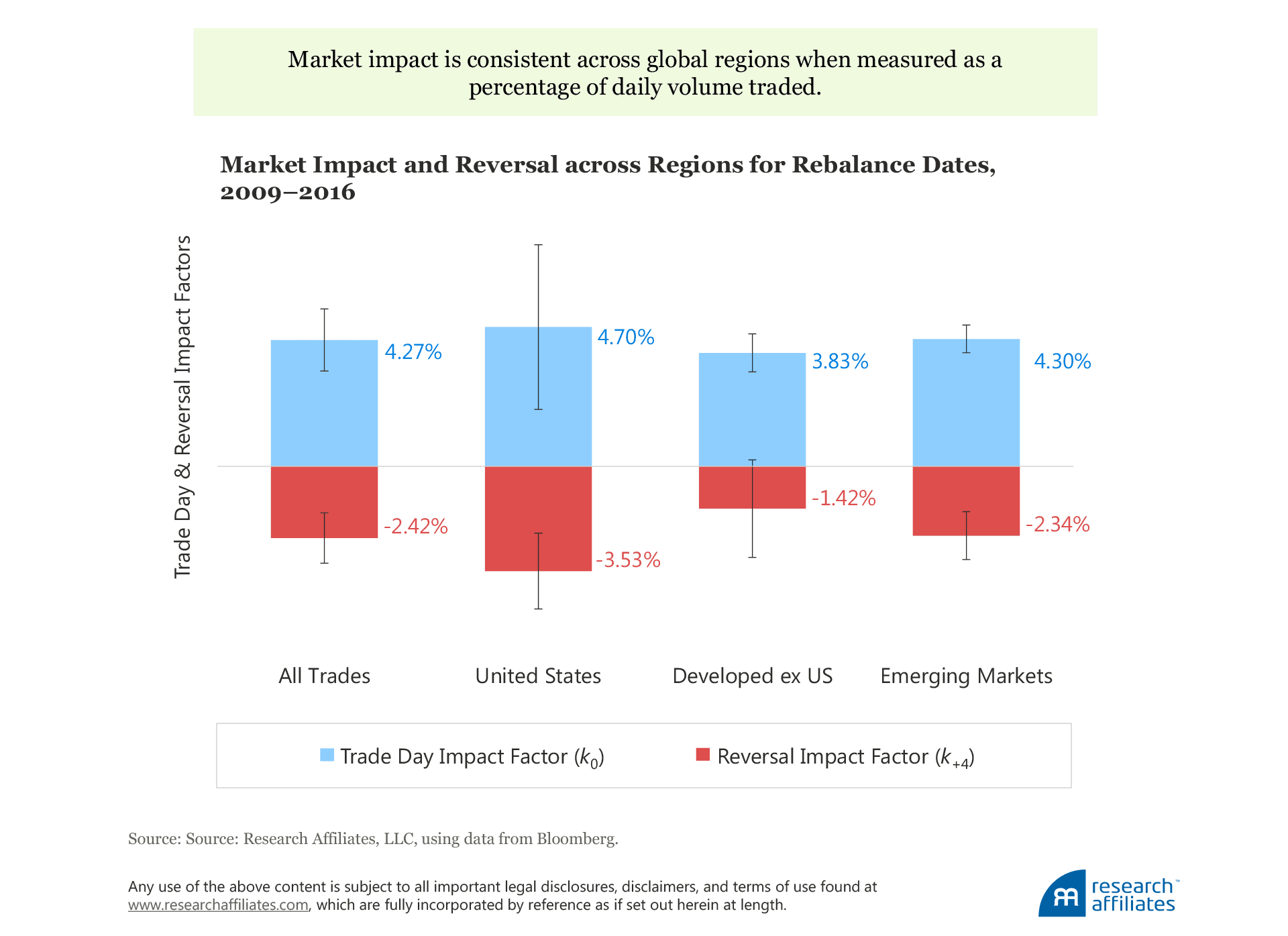 Our research confirms that the magnitude of price impact is predictable because it is directly related to the size of the trade and the security’s liquidity. Strategies incur approximately 30 bps of trading costs due to market impact for every 10% of a stock’s average daily volume traded in aggregate. Significant evidence of a pattern that holds across global markets also comes to light: a market impact of 43 bps, on average, on the rebalance day, with partial reversal over the next four days. Our analysis, over the period 2009–2016 of the US market, developed markets excluding the United States, and emerging markets, indicates that for every 10% of volume traded in a stock, the price changes 43 bps, on average, against the trade on the trade day, and 24 bps in the other direction over the next four days.