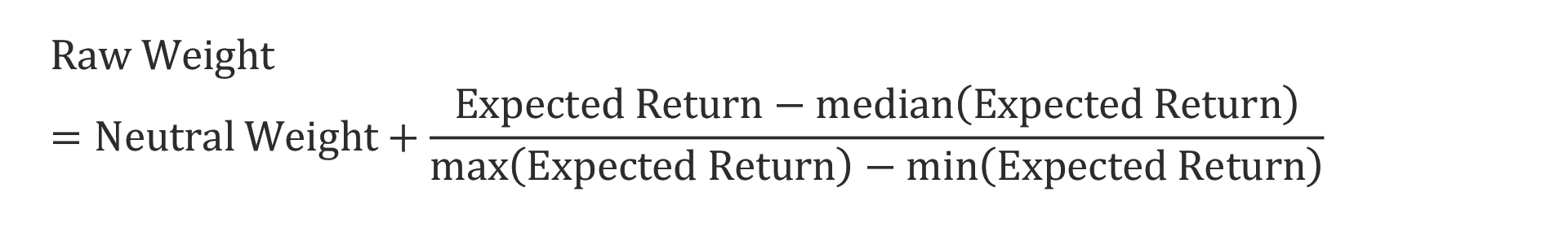 The first step is to create a confidence score (i.e., raw weight) for each asset5 by comparing the current expected return to its historical median using a variant of standard min–max scaling. The confidence score then indicates the amount of the over- or underweight compared to the neutral position. The following equation shows that if the current expected return is higher than the historical median, the raw weight implies an overweight to the asset, or if less, an underweight: