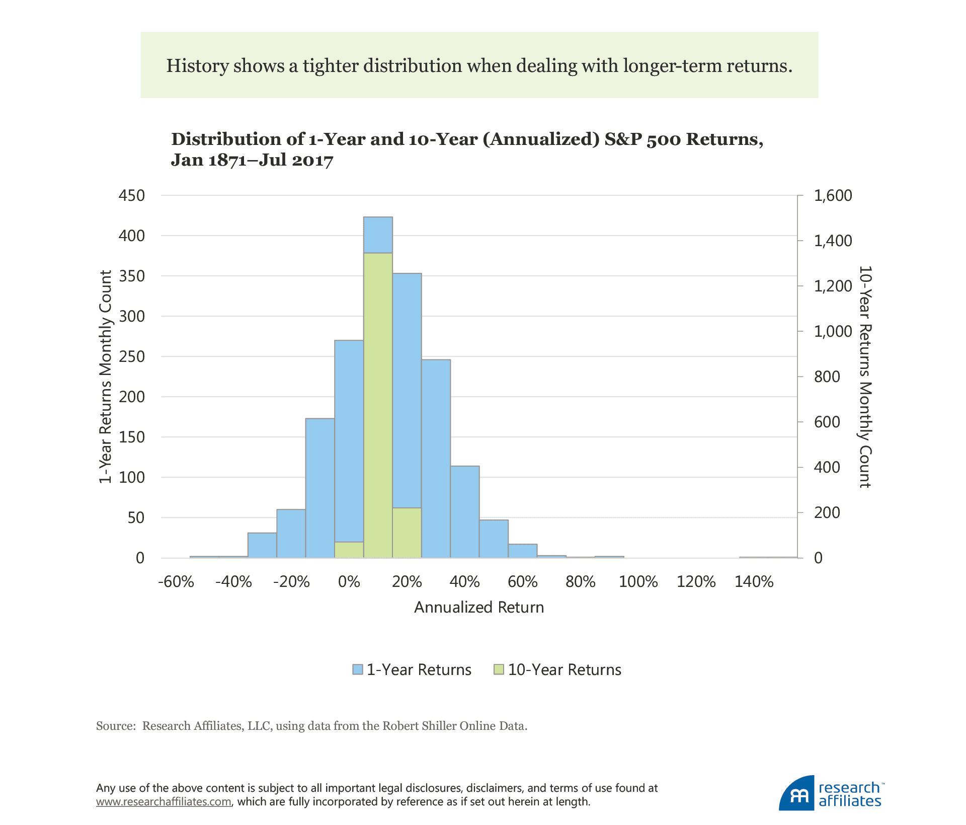 To reduce the impact of idiosyncratic shocks that occur in asset returns, we focus on long-term returns because, historically, the more returns that are averaged together, the tighter the distribution. My intent with this point is not to introduce a debate on mean reversion, but simply to acknowledge the data we have historically observed across markets. For example, over the last 140 years in the US equity market, Aked and Ko (2017) show that, for a 1-year horizon, the volatility of returns has been 19.2%, while at a 10-year horizon, the volatility dropped to 4.7%.3