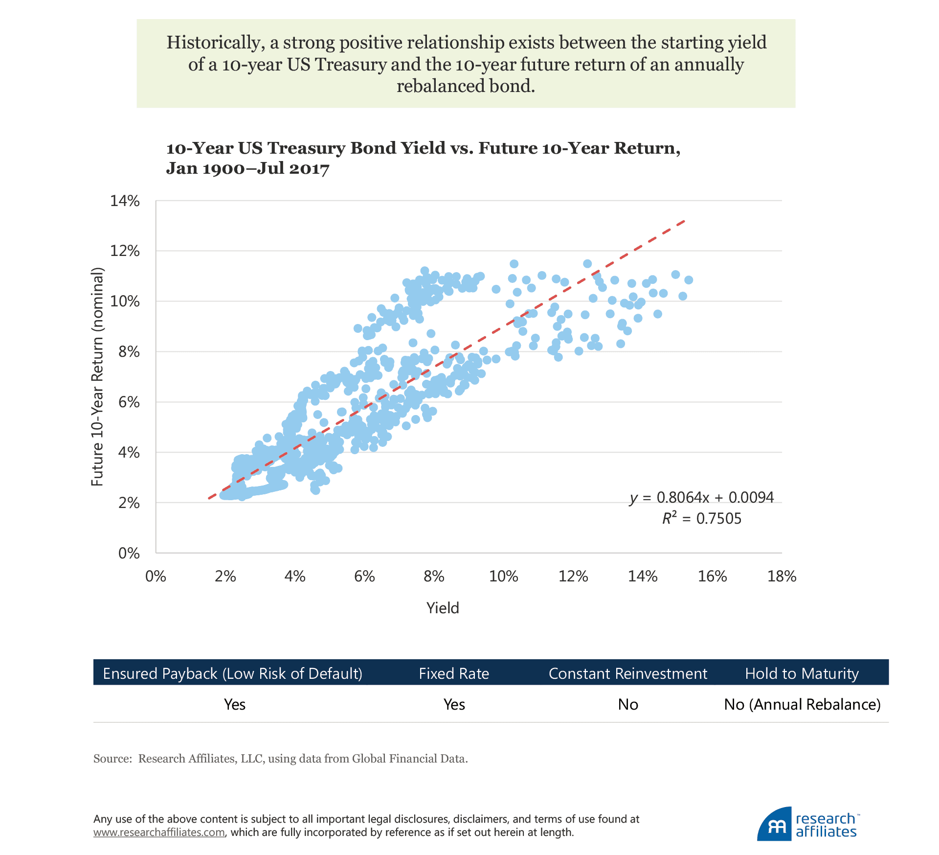 As noted earlier, the process of calculating an asset’s expected return is related to how much we must relax assumptions of quality, cash flows, reinvestment rate, and holding horizon. To better understand this framework, let’s look at an example of a 10-year fixed-rate US Treasury bond (historically, without default) and compare the purchase yield to the total nominal return.4