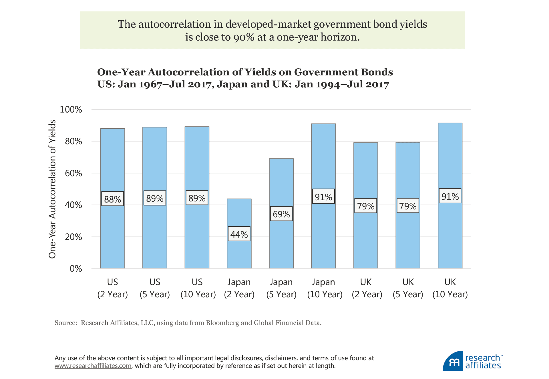 This relationship will hold for any similar security; it is not inherently unique to US Treasury bonds. In fact, the important metric is the autocorrelation in yields, which for a number of developed-market government bonds is close to 90% at a one-year horizon. This means a strong relationship exists between the yield of a bond today and the yield of a similar bond issued one year ago. Therefore, if it is not possible to hold the bond to maturity, a “similar” instrument will typically be obtained by selling the bond owned after one year and purchasing a new bond having the original maturity (creating a pseudo-constant maturity instrument); in the earlier example, this involved selling the original 10-year maturity after one year and purchasing a new 10-year maturity.