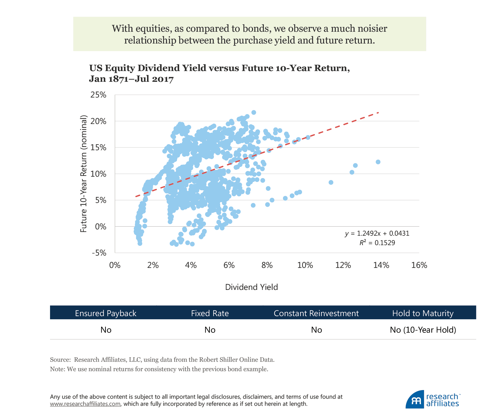 Stocks, by their very nature, require us to relax each of our four initial assumptions or conditions. Equity holders are often wiped out by default, intermediate cash payments and reinvestment conditions change over time, and stocks do not have a predefined maturity date at which the investor’s principal is returned. For these reasons, we expect, and see, a much noisier relationship between an investor’s purchase yield and future return. At a 10-year investment horizon, however, a meaningfully positive relationship still exists, albeit with a greater amount of dispersion around the trend. Historically speaking, starting dividend yield has done a nice job of predicting future returns!