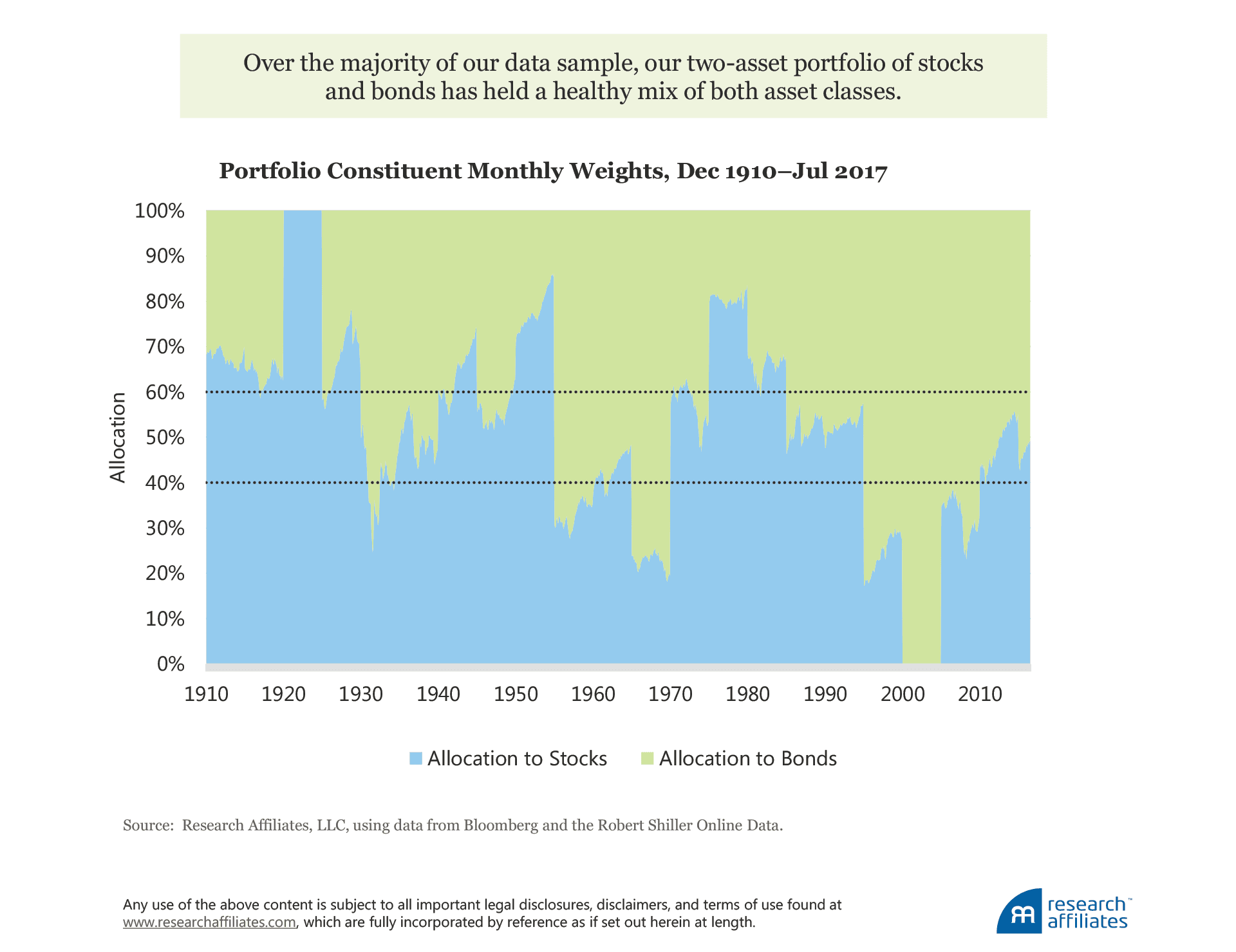 Over our data sample, two periods existed in which the portfolio was 100% invested in a single asset. In the early 1920s, the portfolio was 100% invested in stocks, whereas in the early part of the current century, it was 100% invested in bonds. The majority of the time, however, our portfolio has held a healthy mix of both assets. For example, starting in the 1960s and through the inflationary 1970s, the portfolio loaded up on stocks and sold bonds, before reversing course through the 1980s and 1990s. More recently, the strategy views both stocks and bonds as expensive and has been moving toward a more neutral 60/40 weight.